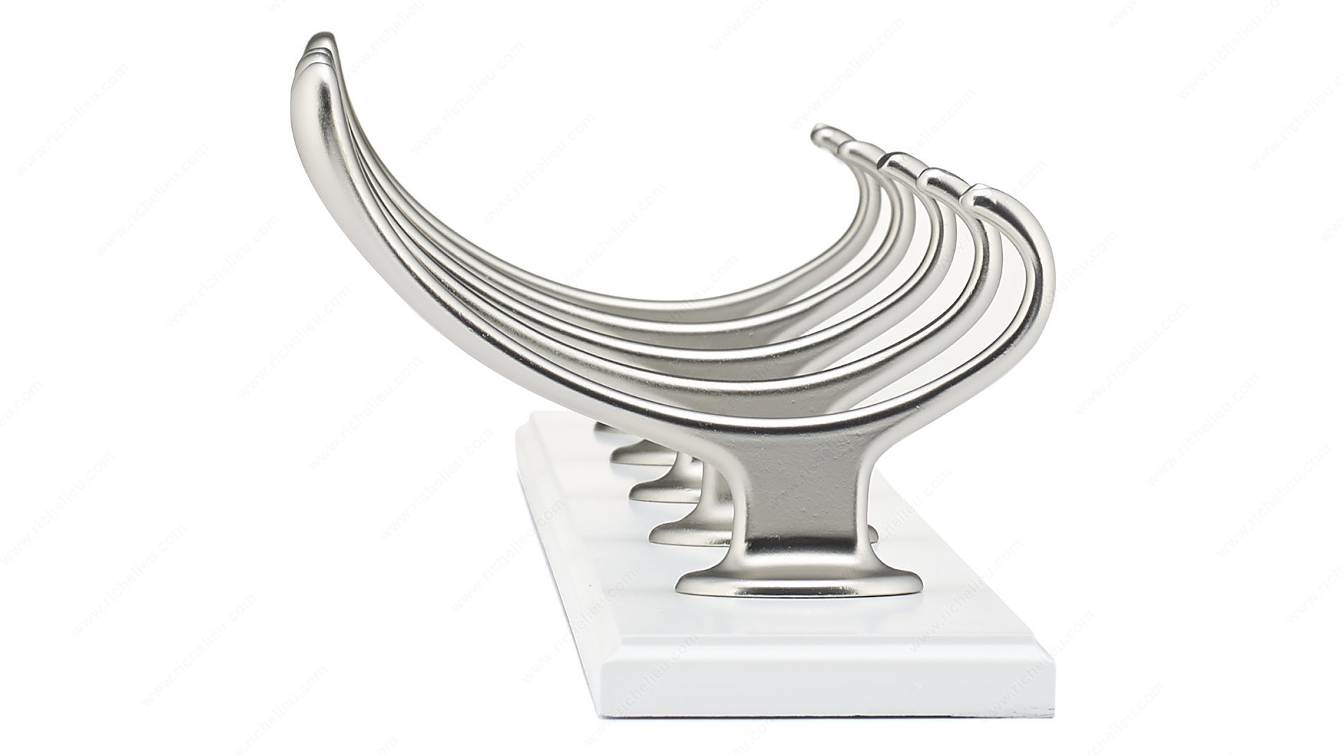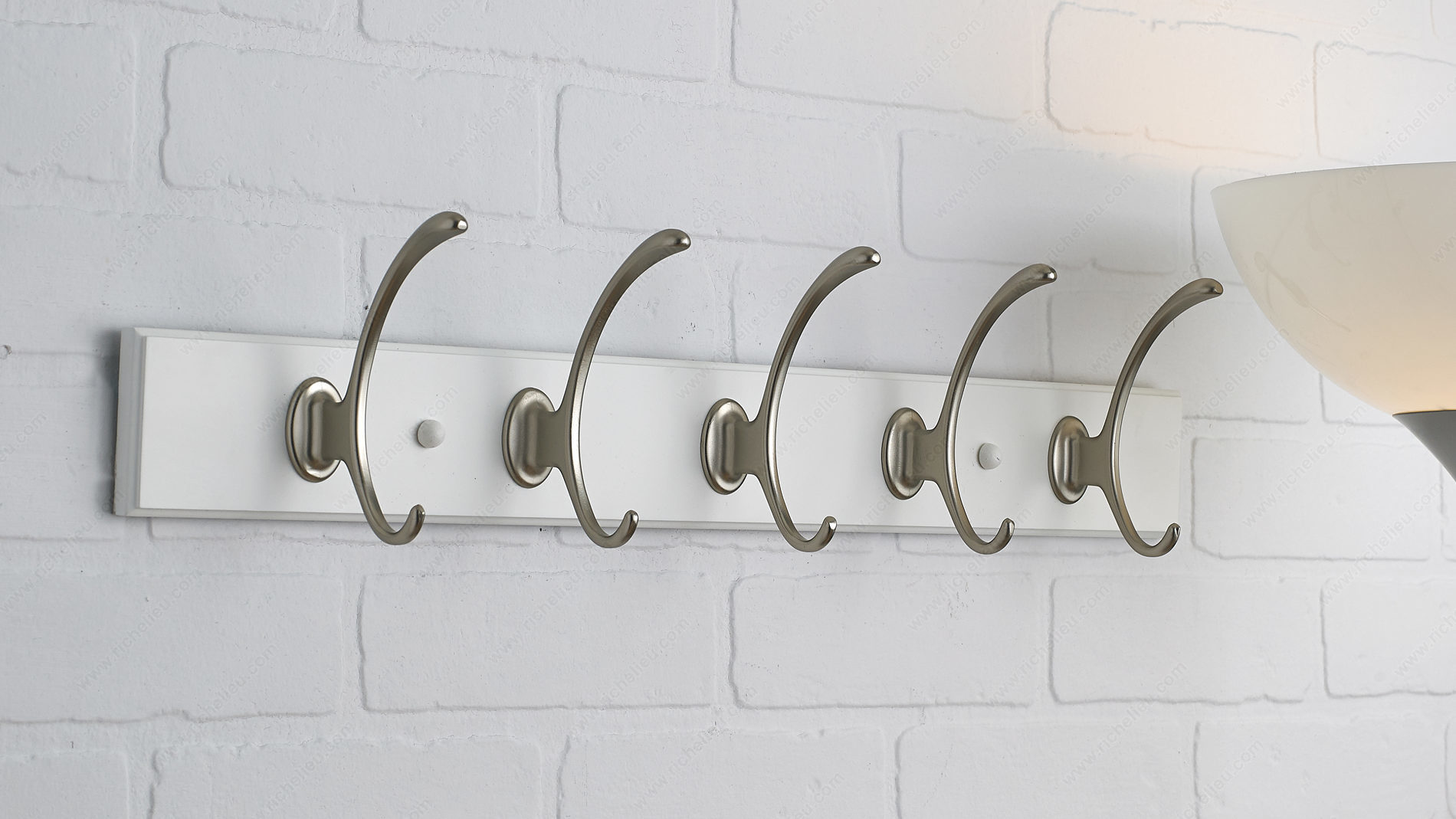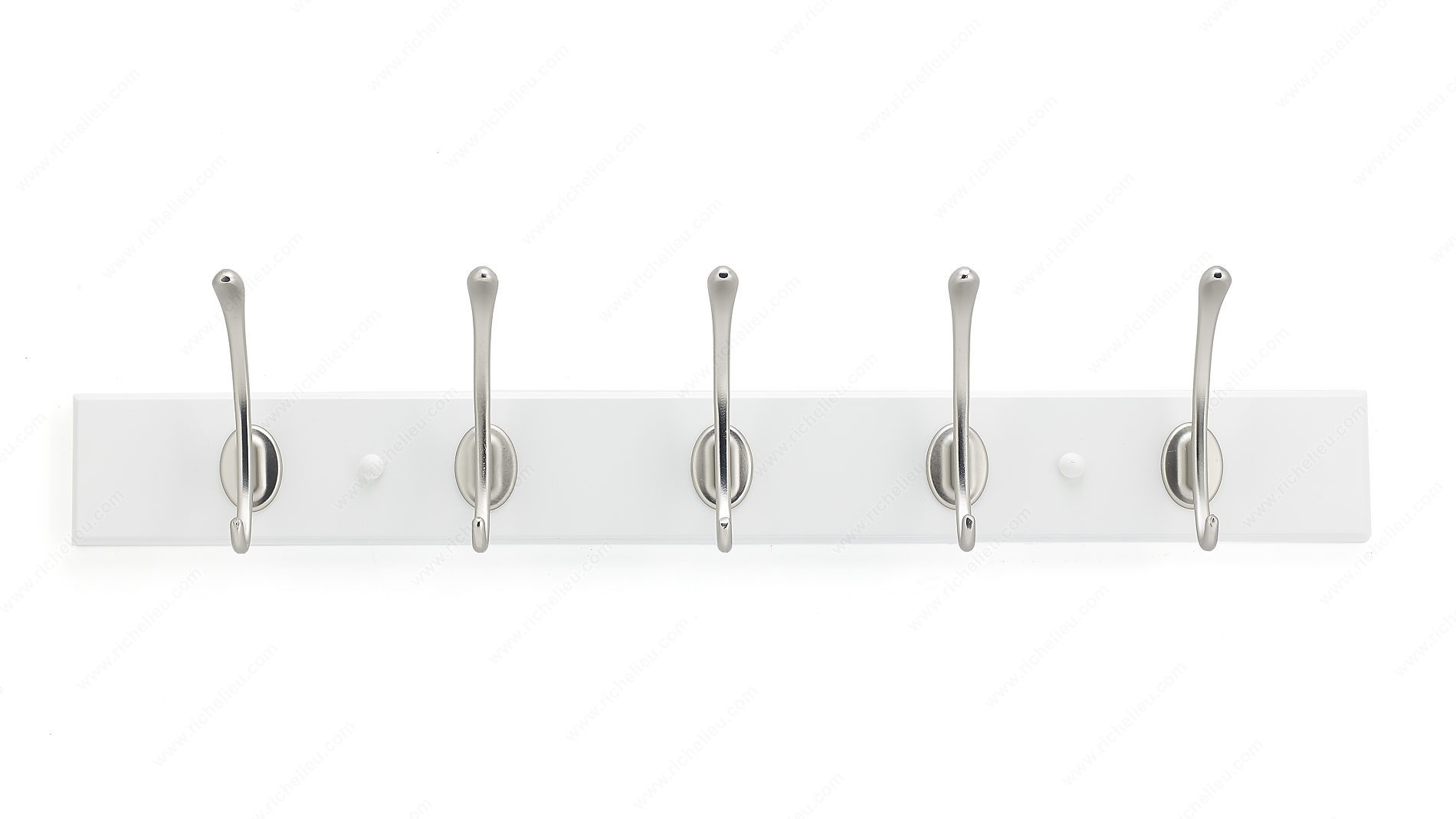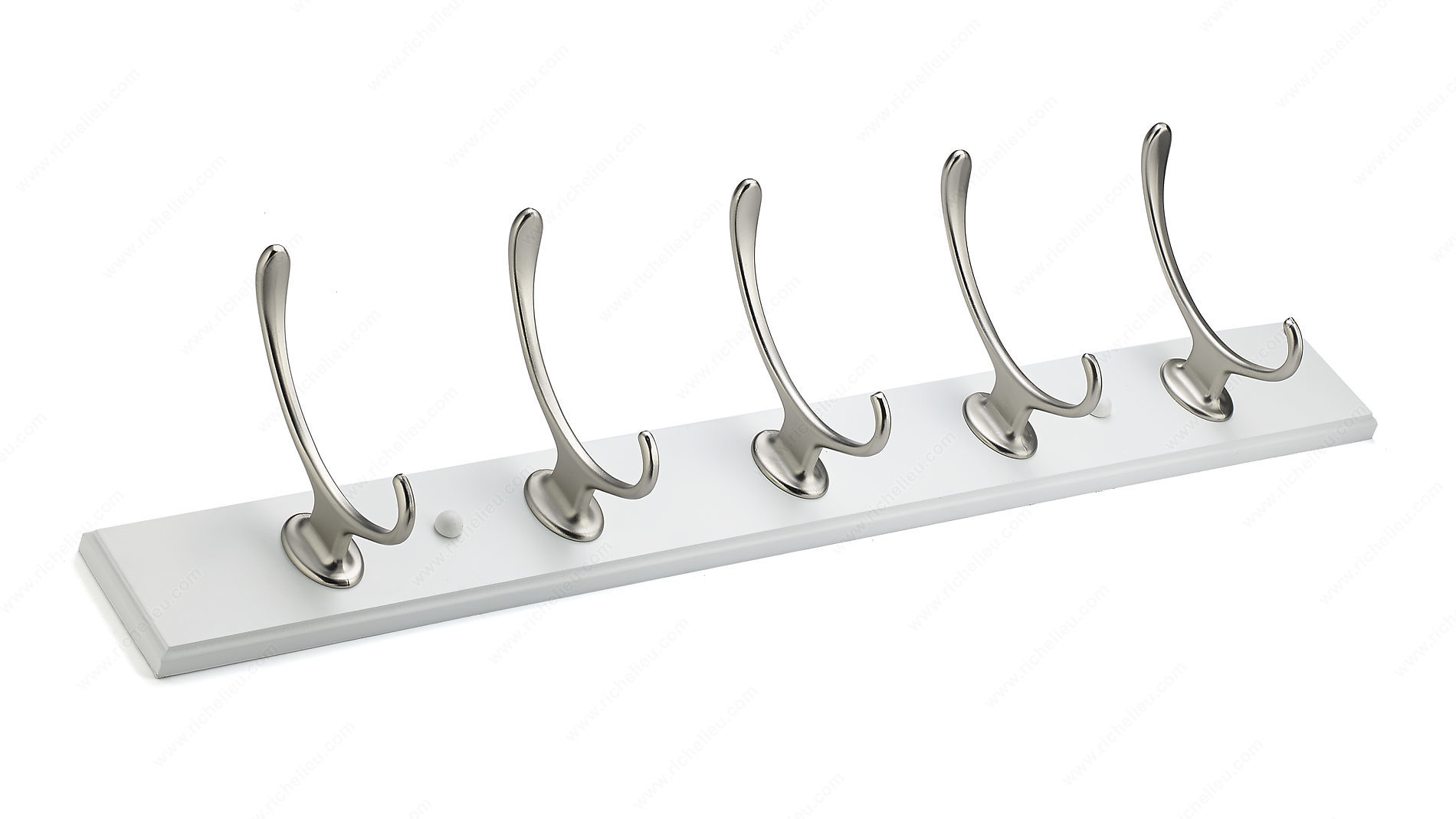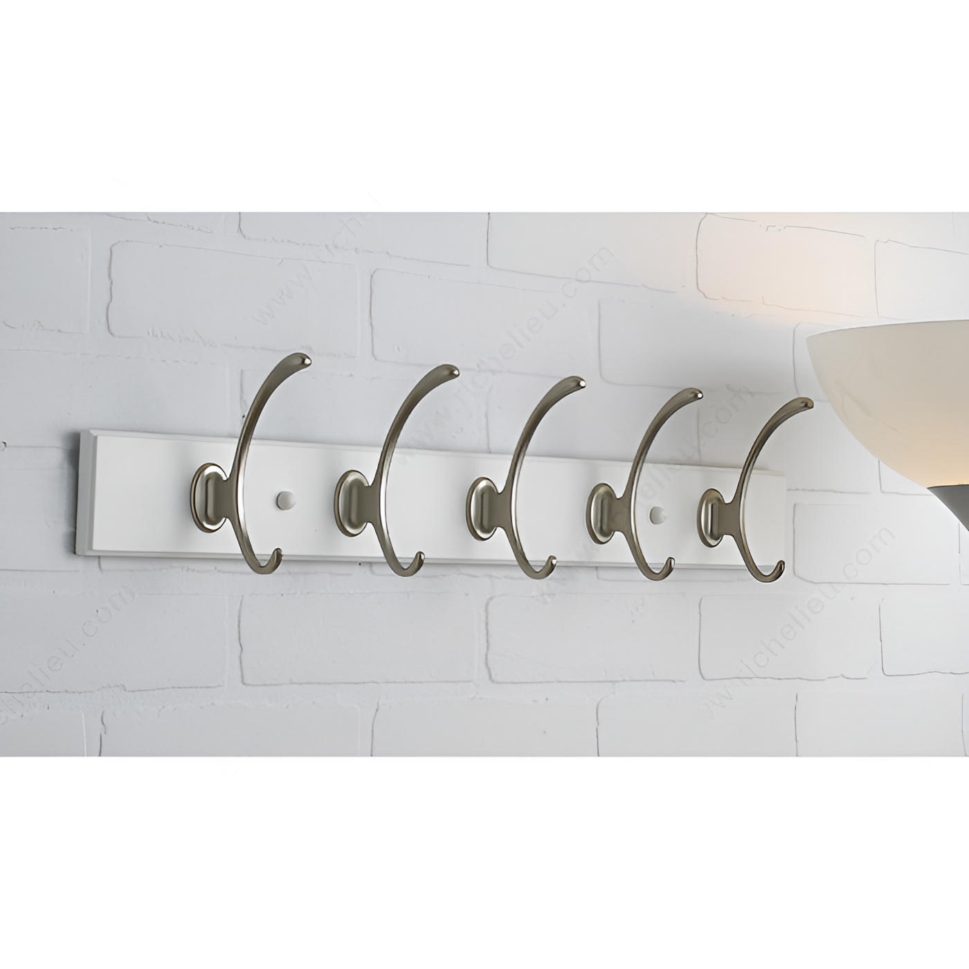 Richelieu T0010210195 Transitional Hook Rack - 001 seamlessly blends contemporary and traditional aesthetics, making it a stylish and functional addition to any home decor. This trendy hook rack is crafted from durable metal and wood, providing a robust solution for organizing your space. With a generous load capacity of 22 lbs, it is perfect for hanging coats, bags, or accessories while maintaining a sleek profile. Measuring 23 7/8 inches in width and 2 25/32 inches in height, the rack's design features a center-to-center distance of 12 7/8 inches between hooks, allowing for optimal spacing without compromising on accessibility. The elegant combination of a white board finish with brushed nickel and chrome accents enhances its visual appeal, making it suitable for various interior styles. For optimal performance, it is recommended to mount the hooks directly to wall studs, typically found at 16-inch intervals. If studs are not available, appropriate drywall anchors (not included) should be used to ensure secure installation. The package includes screws for easy setup. Whether you’re looking to declutter an entryway or add a touch of sophistication to your home, the Richelieu Transitional Hook Rack is the perfect choice for both functionality and style.