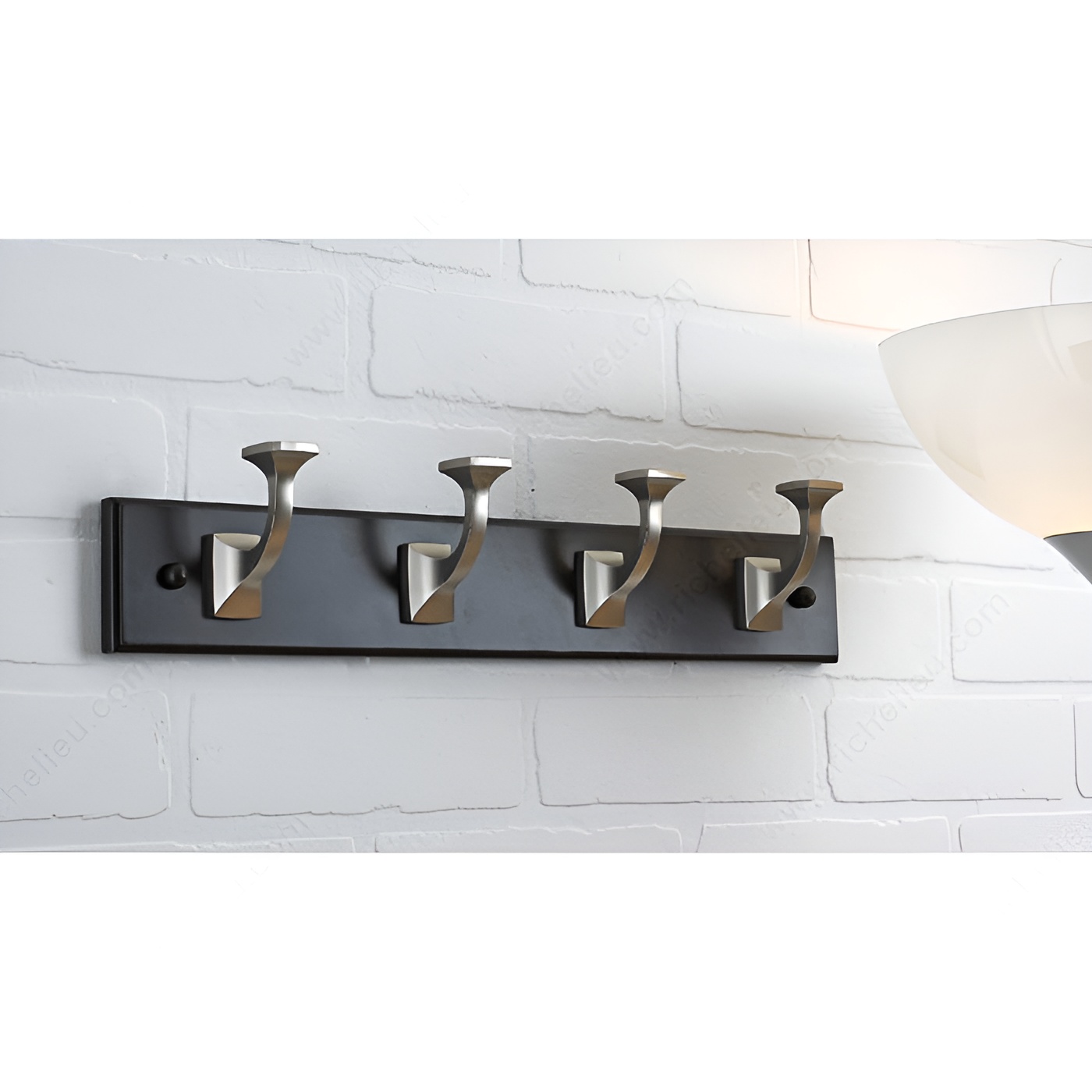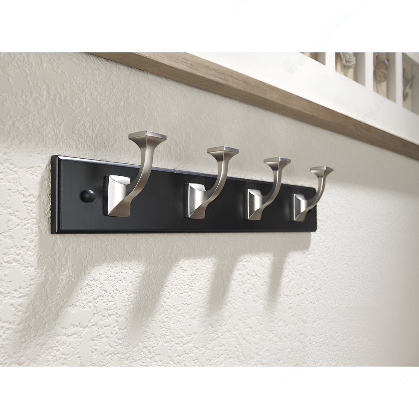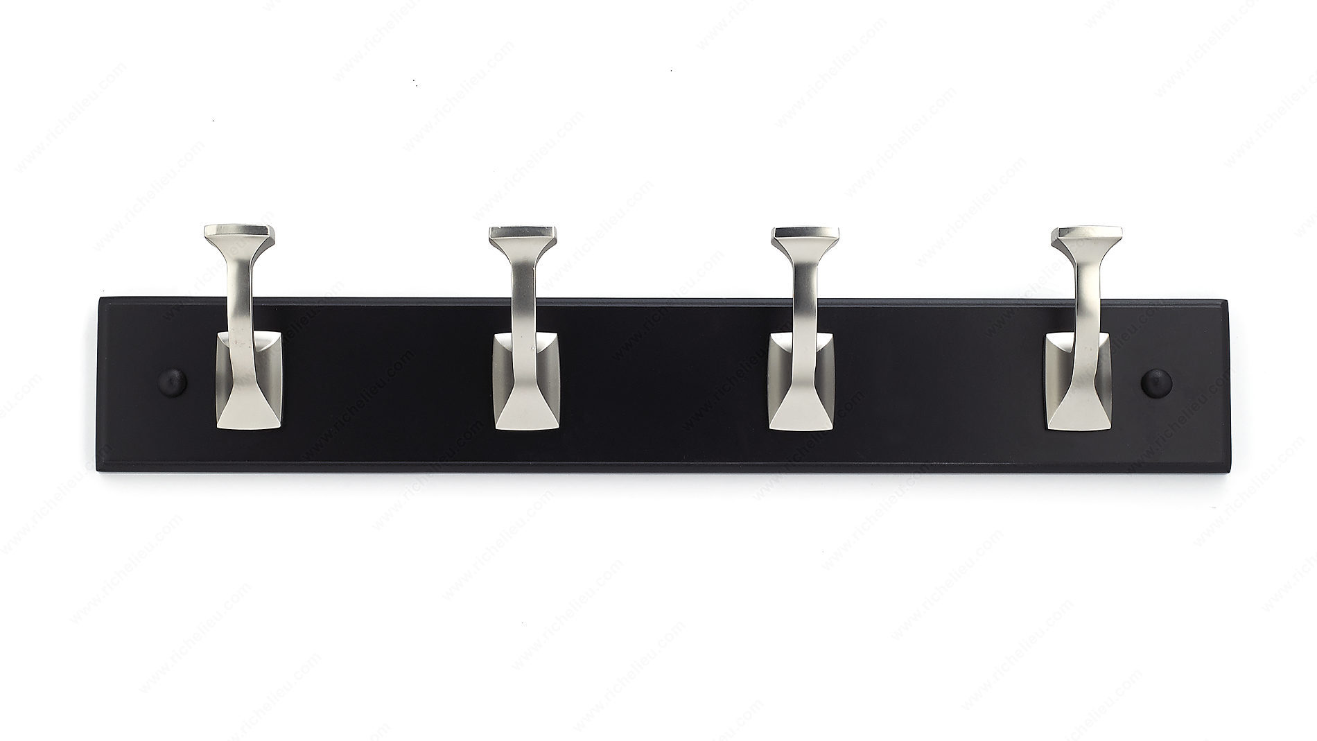 Richelieu T040214195 Transitional Hook Rack - 0402 combines contemporary design with a traditional aesthetic, making it an essential addition to various home interiors. Constructed from durable metal and MDF, this hook rack features multiple hooks that showcase a strong and attractive look, ensuring that functionality does not compromise style. With an overall width of 18 inches and a height of 2 25/32 inches, it fits seamlessly into any space while providing ample room for hanging coats, bags, or accessories. The hooks have a load capacity of 22 pounds, making them robust enough for everyday use. The board finish in sleek black, complemented by brushed nickel options, enhances its versatility, allowing it to blend effortlessly with both modern and classic décor. The hook rack's design features a center-to-center spacing of 15 5/8 inches, ensuring easy installation with the included screws and nails. Its overall projection of 2 11/16 inches keeps it compact while maximizing utility. Whether in an entryway, hallway, or mudroom, the Richelieu T040214195 Transitional Hook Rack - 0402 is a stylish and practical solution for organizing your space.