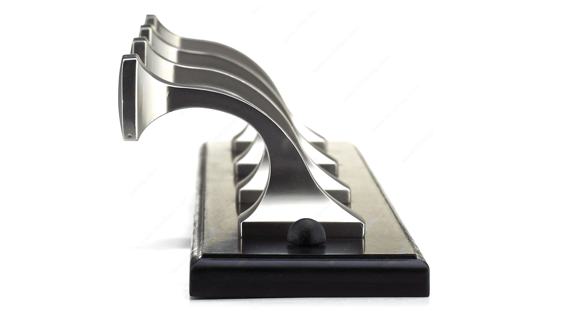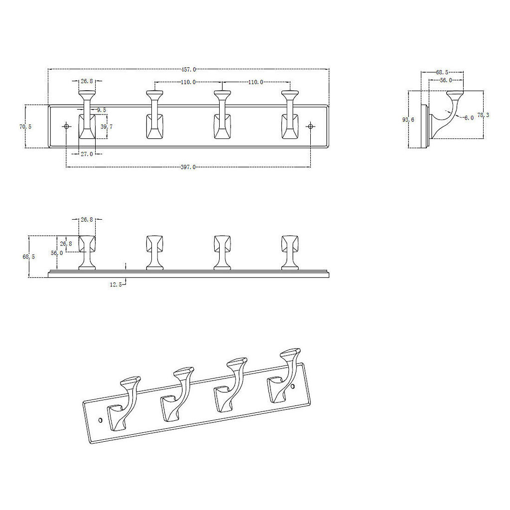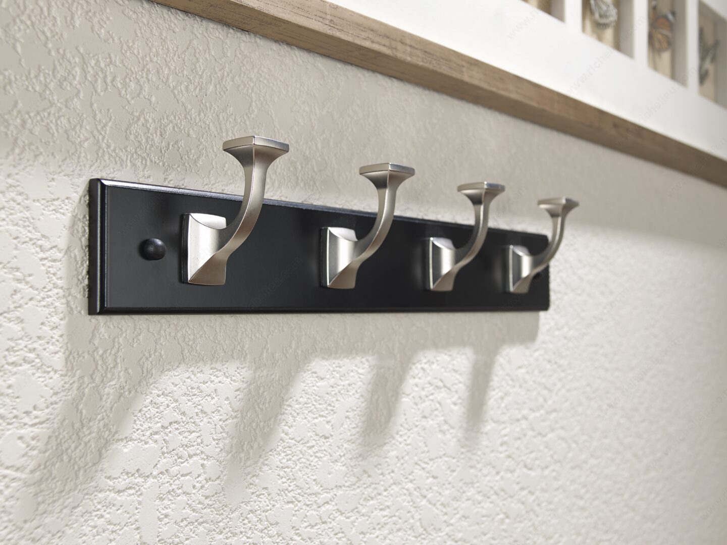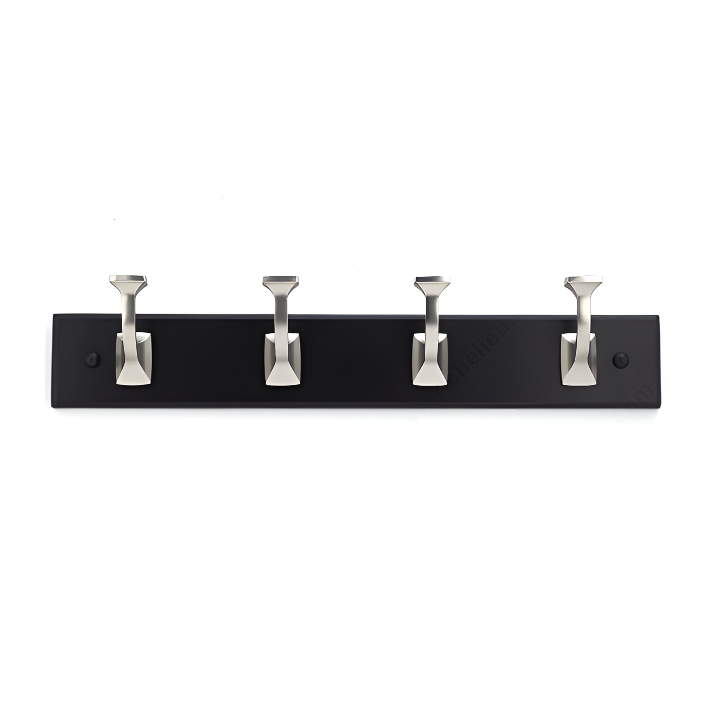 Richelieu T040214195 Transitional Hook Rack - 0402 combines contemporary design with a traditional aesthetic, making it an essential addition to various home interiors. Constructed from durable metal and MDF, this hook rack features multiple hooks that showcase a strong and attractive look, ensuring that functionality does not compromise style. With an overall width of 18 inches and a height of 2 25/32 inches, it fits seamlessly into any space while providing ample room for hanging coats, bags, or accessories. The hooks have a load capacity of 22 pounds, making them robust enough for everyday use. The board finish in sleek black, complemented by brushed nickel options, enhances its versatility, allowing it to blend effortlessly with both modern and classic décor. The hook rack's design features a center-to-center spacing of 15 5/8 inches, ensuring easy installation with the included screws and nails. Its overall projection of 2 11/16 inches keeps it compact while maximizing utility. Whether in an entryway, hallway, or mudroom, the Richelieu T040214195 Transitional Hook Rack - 0402 is a stylish and practical solution for organizing your space.