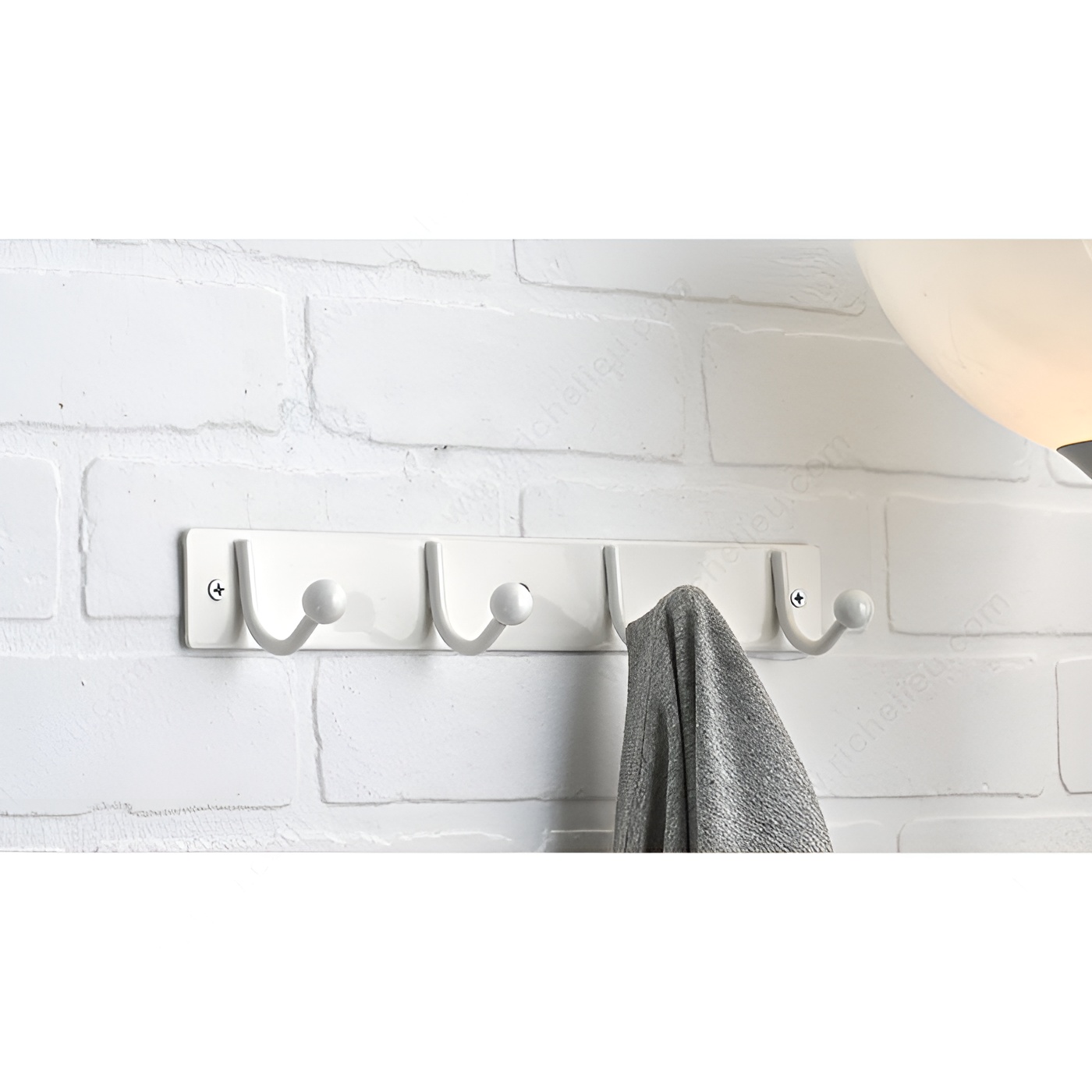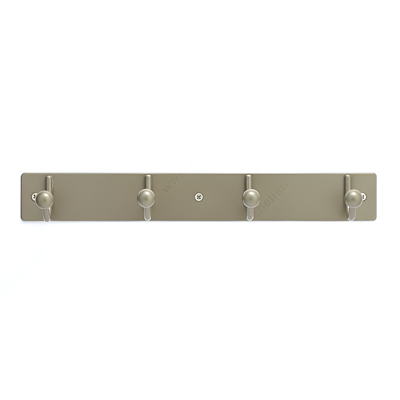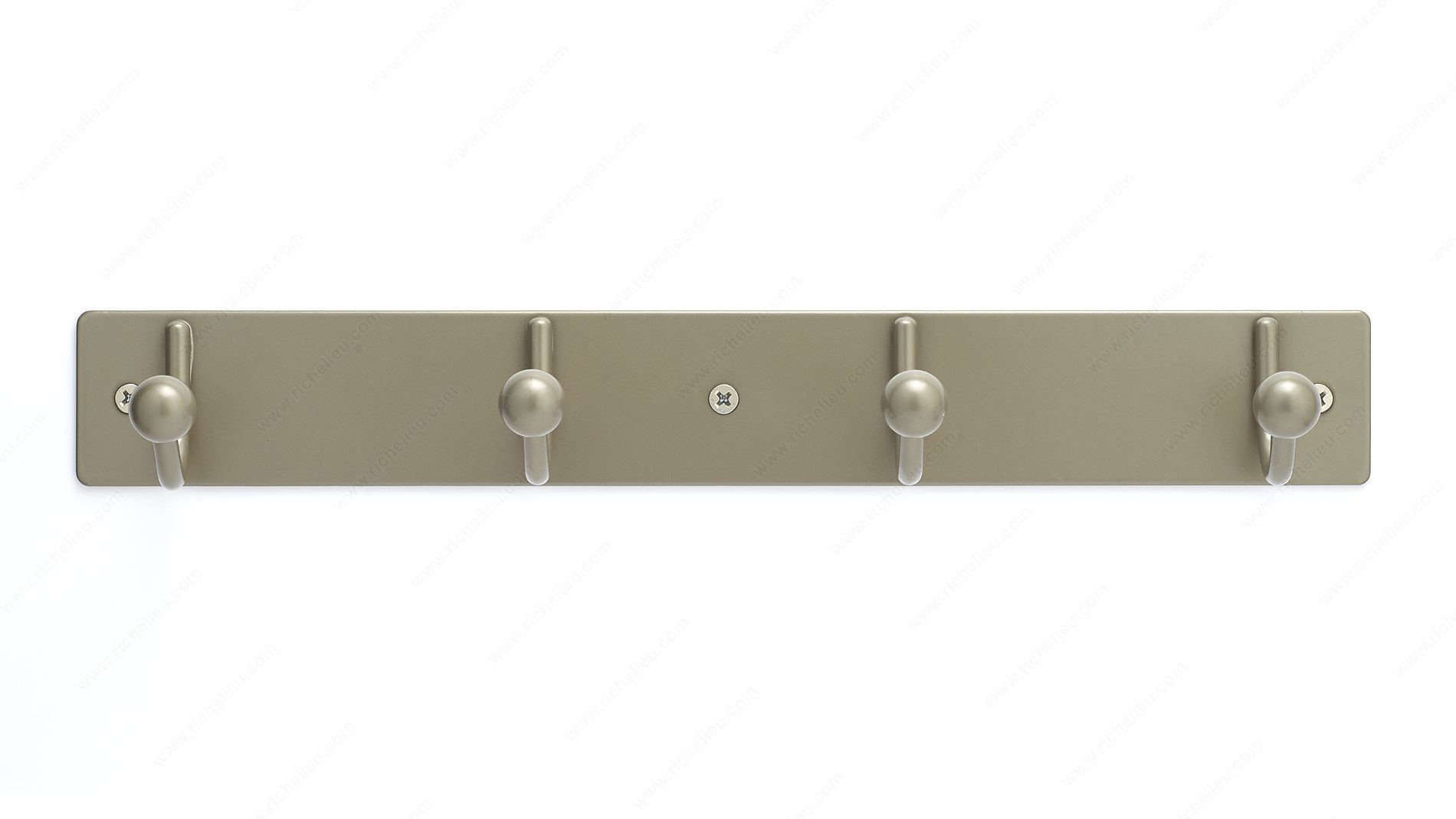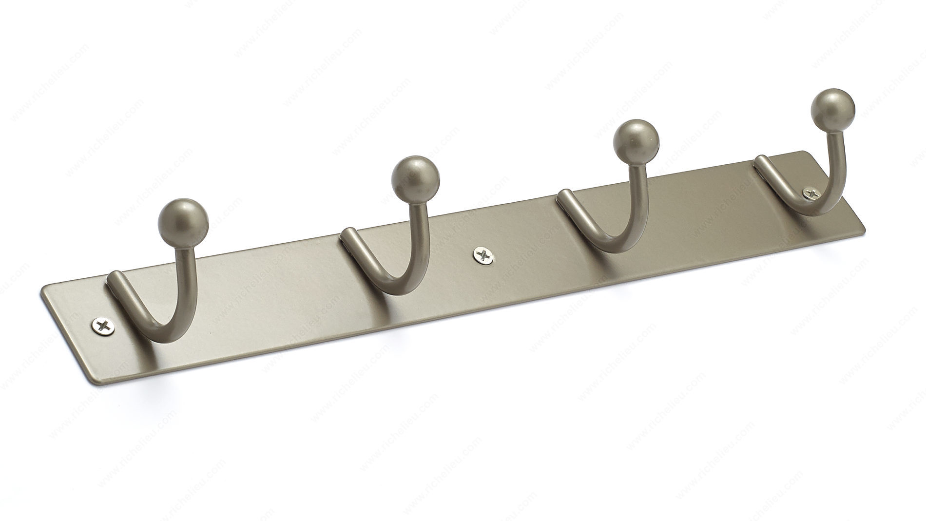 Richelieu T16421184 Utility Hook Rack - 164 offers a perfect blend of functionality and modern design for any space. Featuring four single hooks affixed to a sleek metal frame, this utility hook rack showcases a stylish matte nickel finish that complements a variety of decors. Each hook is designed with ball ends, ensuring that items hang securely while maintaining an elegant appearance. With an overall height of 1 11/16 inches and a width of 12 5/8 inches, this hook rack is compact enough to fit in tight spaces yet offers a robust load capacity of 22 pounds, making it ideal for hanging clothing, bags, or personal items. The center-to-center distance between hooks measures 11 5/8 inches, providing ample space for organization. Installation is straightforward, as the rack can be mounted on walls or doors with included anchors and wood screws. Whether placed in entryways, bathrooms, mudrooms, or bedrooms, the versatile design meets all your storage needs. Packaged in a blister format, the Richelieu Utility Hook Rack is not only a practical addition to your home but also an aesthetically pleasing one. Elevate your space with this essential organizational tool.