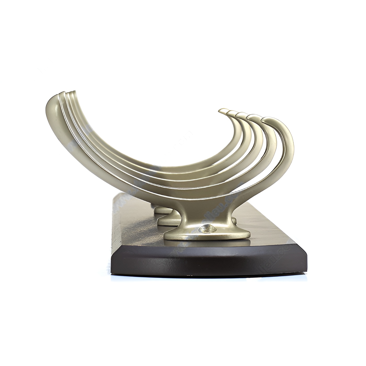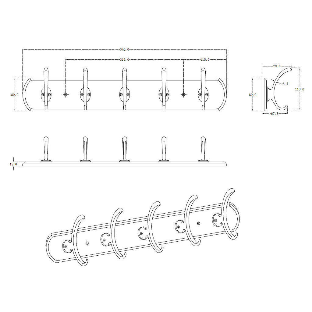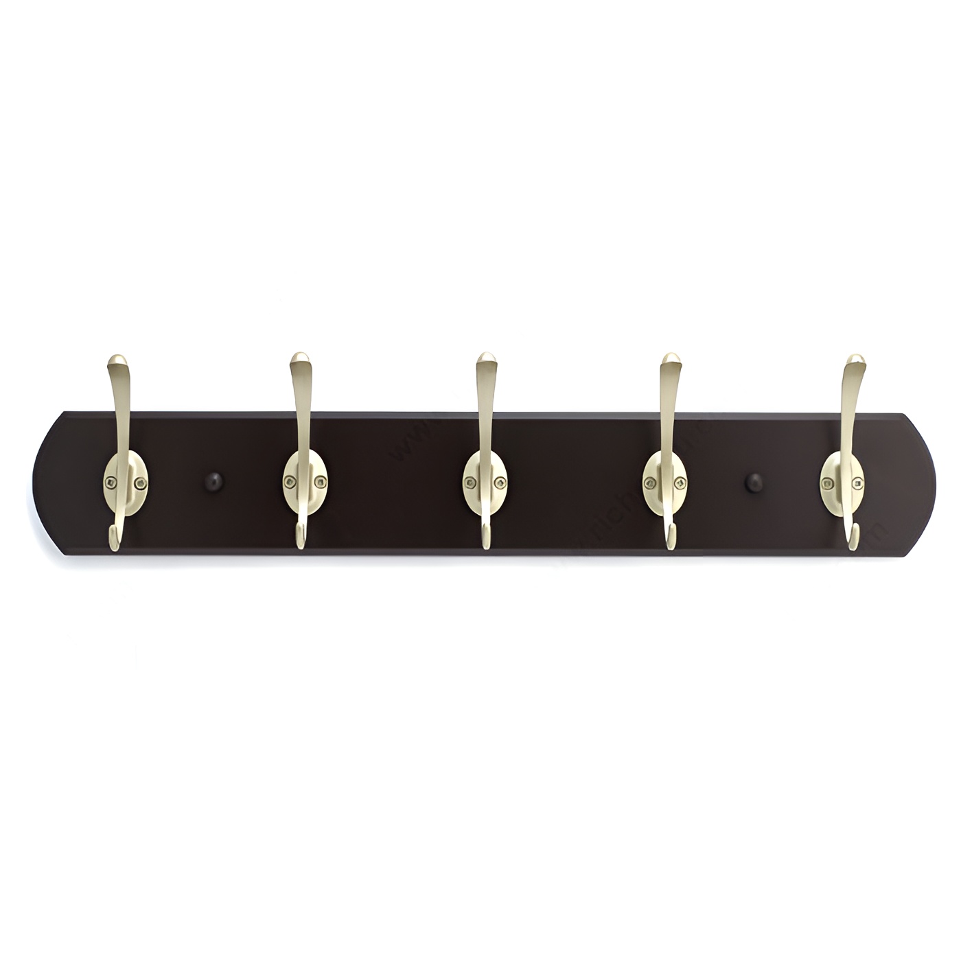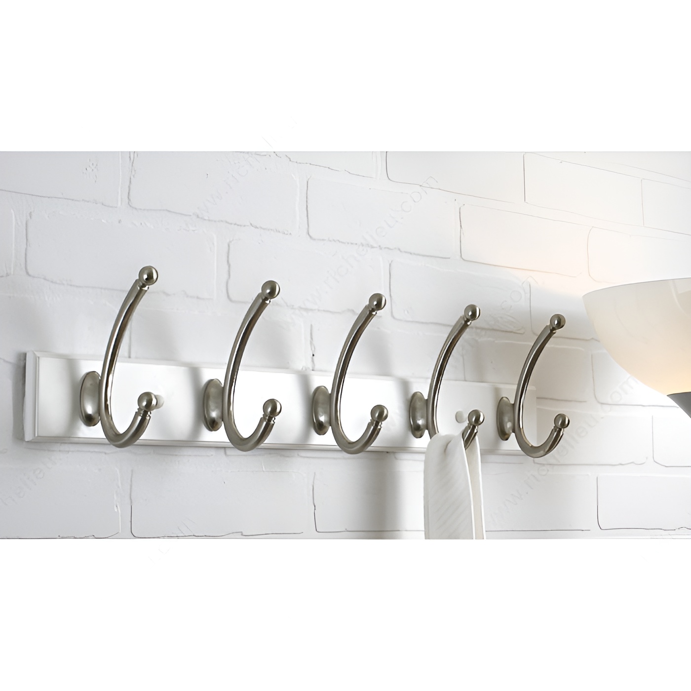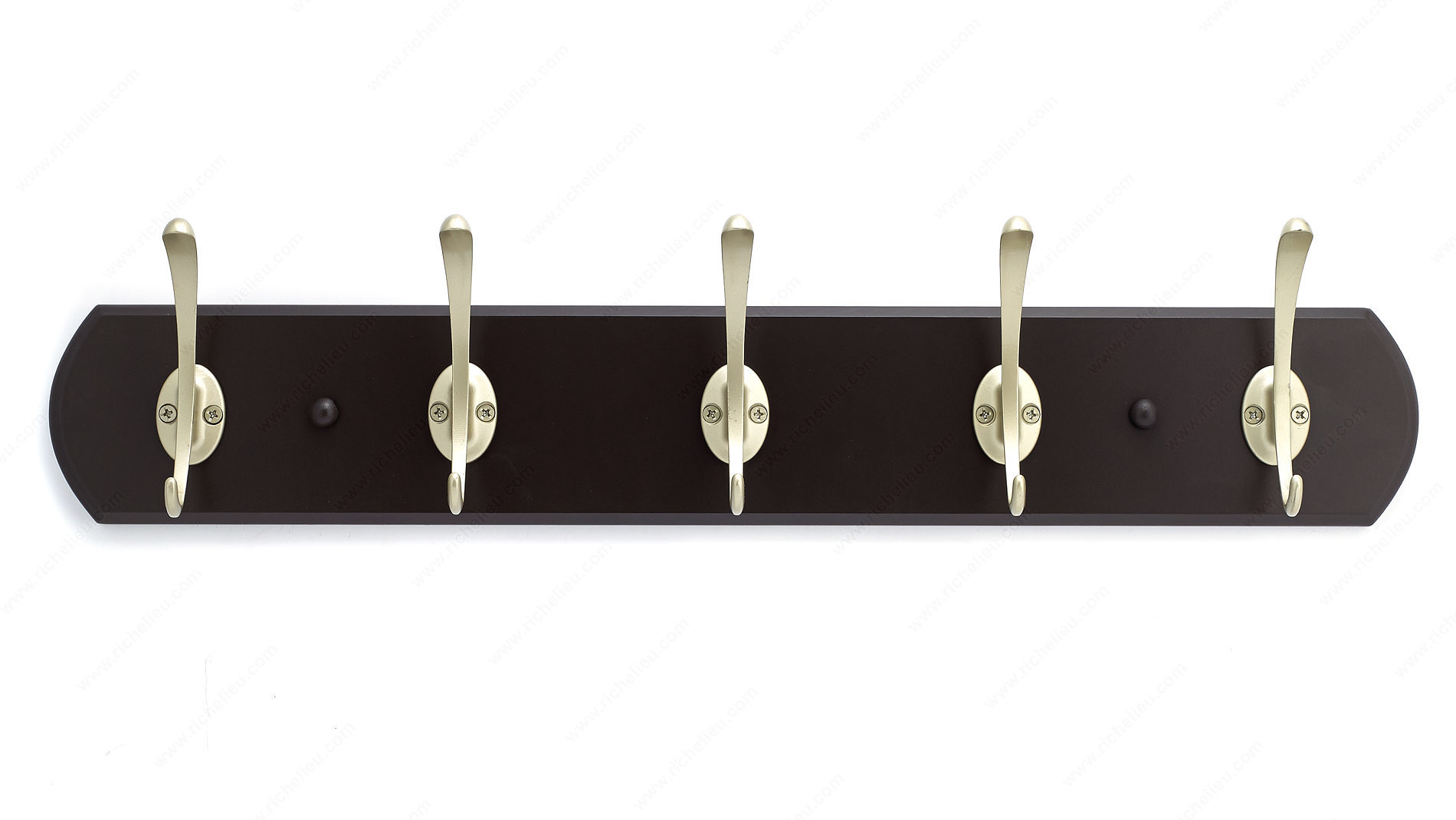 Richelieu T38551184 Transitional Hook Rack - 37 offers a perfect blend of style and functionality for any living space. This elegantly designed hook rack features five well-placed coat hooks mounted on a sturdy board, allowing for efficient organization. The dual arm design enhances storage capabilities, making it ideal for managing coats, bags, or accessories in various settings such as bedrooms, bathrooms, entryways, mudrooms, and closets. Crafted from high-quality metal and wood, the hook rack showcases a sophisticated matte nickel and espresso finish that complements its transitional style. With an overall height of 3 1/2 inches and a width of 21 1/2 inches, it fits seamlessly into any decor. The center-to-center distance of 12 3/8 inches ensures ample space for hanging items without overcrowding. This rack can support a load capacity of up to 22 lbs, making it practical for everyday use. Installation is straightforward, as the necessary screws and nails are included, allowing you to mount it on walls or doors effortlessly. With its minimalist details and timeless design, the Richelieu Transitional Hook Rack not only meets your organizational needs but also enhances the aesthetic of your home.