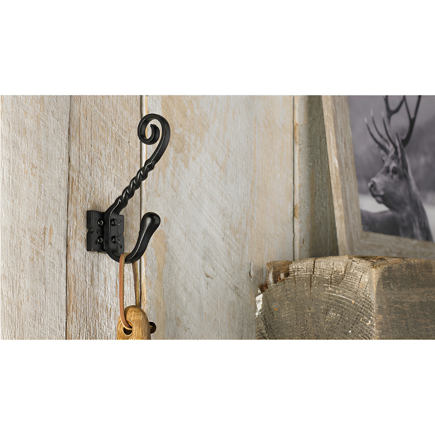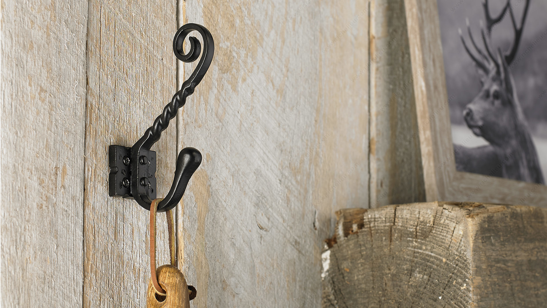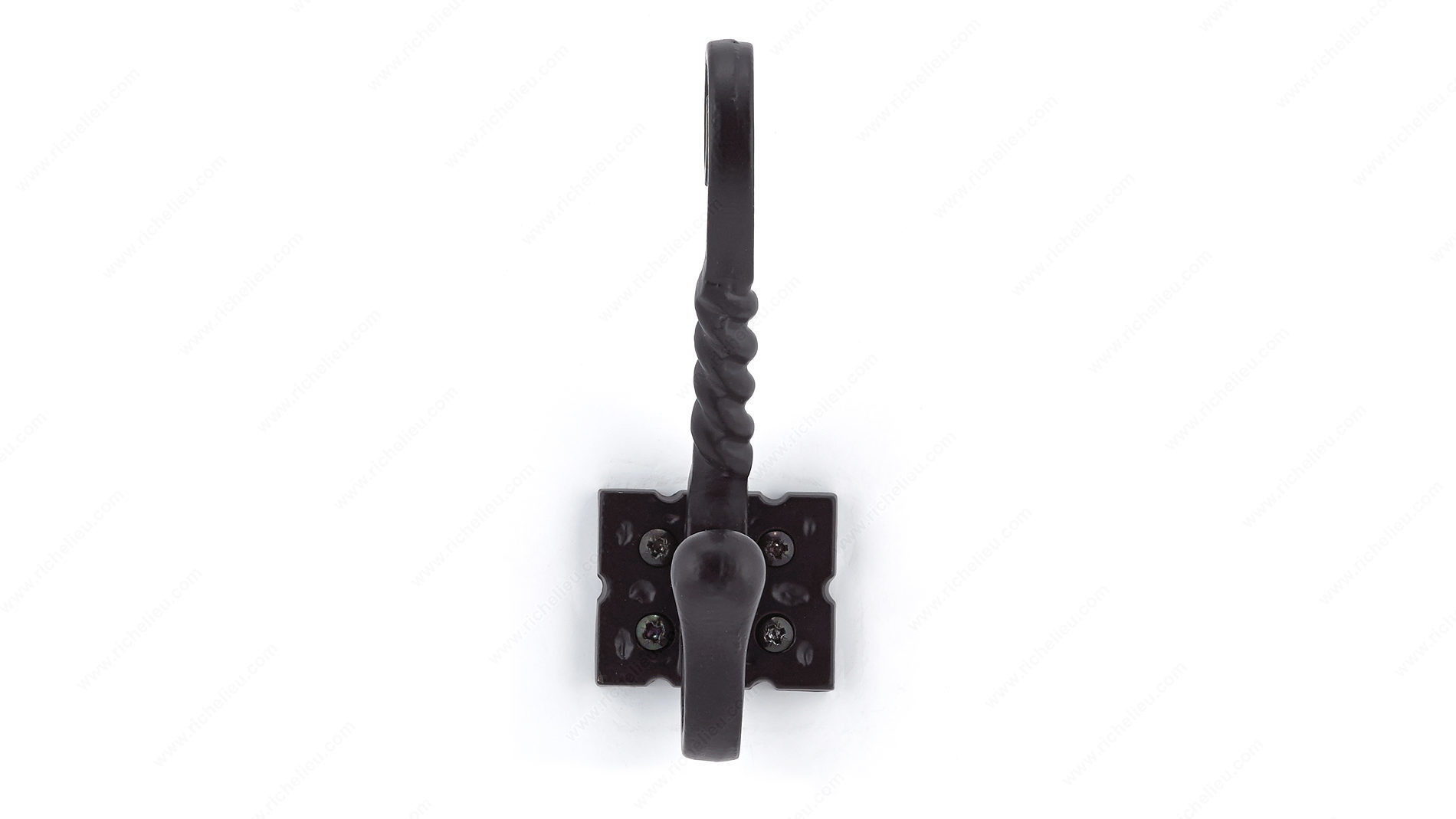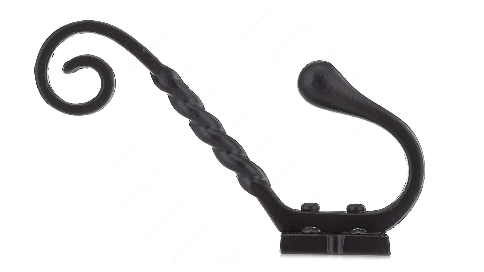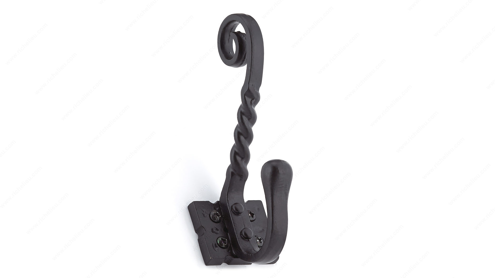Richelieu T5605900 Classic Forged Iron Hook - 5605 combines timeless design with robust functionality, making it an ideal addition to any traditionally themed space. Crafted from durable forged iron, this double hook showcases a striking matte black finish that not only enhances its aesthetic appeal but also ensures longevity and resilience against wear. With an overall height of 5 1/2 inches and a projection of 3 1/16 inches, this hook offers ample space for hanging items while maintaining a sleek profile. The hook's classic style, complemented by its old-fashioned influence, provides a bold statement that harmonizes beautifully with your decor. Boasting a load capacity of 33.1 pounds, it is perfect for holding coats, bags, or other accessories without compromising on strength. Installation is a breeze, as the necessary screws are included, allowing you to quickly enhance your space. The center-to-center measurement of 5/8 inch ensures compatibility with various mounting surfaces. Whether used in a hallway, entryway, or kitchen, the Richelieu T5605900 Classic Forged Iron Hook is a practical and stylish choice that elevates both functionality and design in your home.