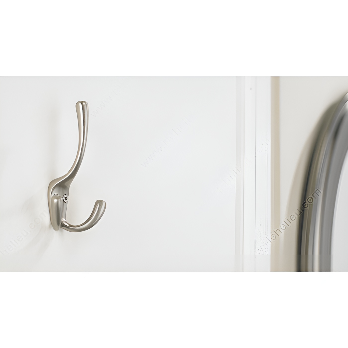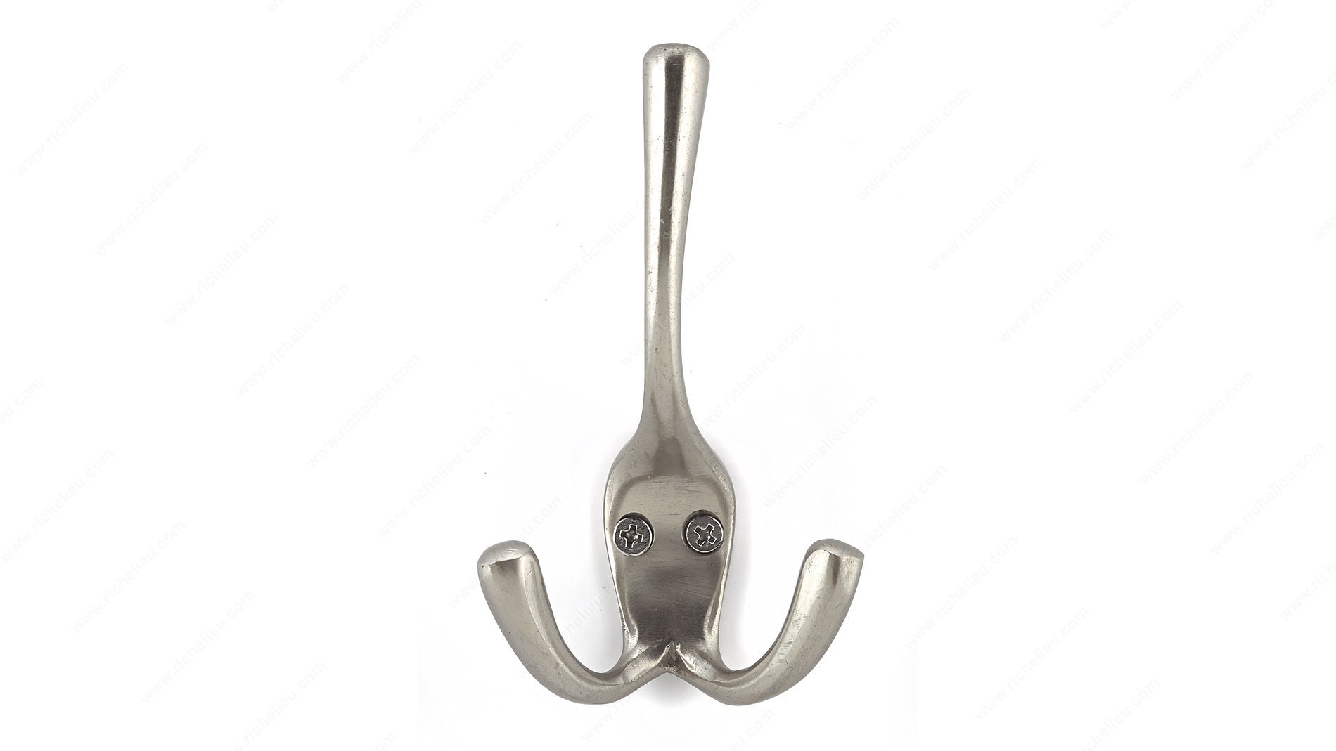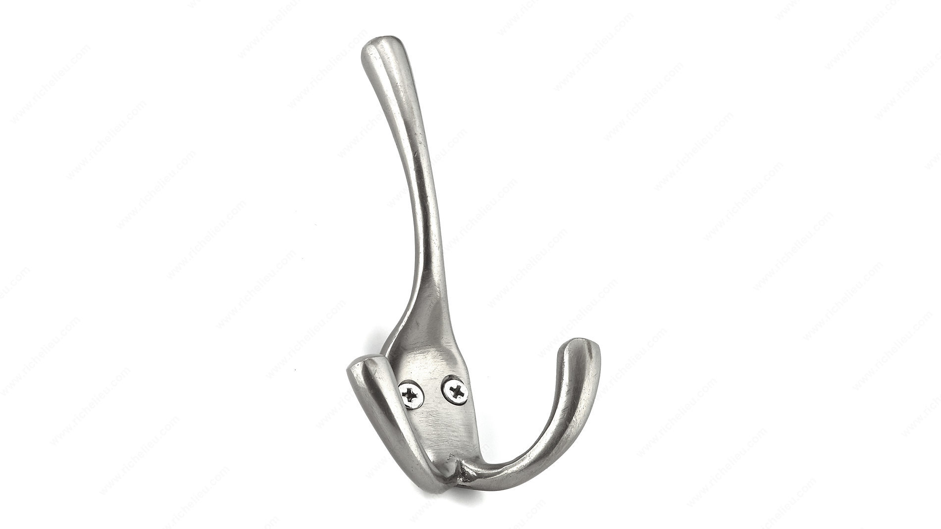 Richelieu T5611184 4-1/2 in Triple Utility Hook - 5611 offers a perfect blend of convenience and functionality, designed to optimize space in narrow entryways. With a sleek matte nickel finish, this utility hook not only enhances your decor but also provides practical solutions for hanging various items. Measuring 4 23/32 inches in height and 3 3/32 inches in width, this hook features a compact design that fits seamlessly into tight spaces. The overall projection of 1 11/32 inches ensures it remains unobtrusive while still being highly effective. Its robust metal construction allows for a load capacity of up to 22 pounds, making it suitable for a variety of uses, from coats to bags. The hook is designed with a center-to-center measurement of 15/32 inches, ensuring an efficient installation process. Included screws make setup straightforward, so you can have your new hook ready to use in no time. The combination of gray and chrome colors adds a modern touch that complements any interior style. Ideal for both building professionals and discerning homeowners, the Richelieu T5611184 Triple Utility Hook is a smart addition to any space that values both style and practicality.