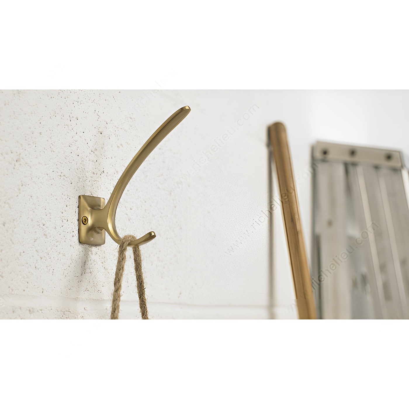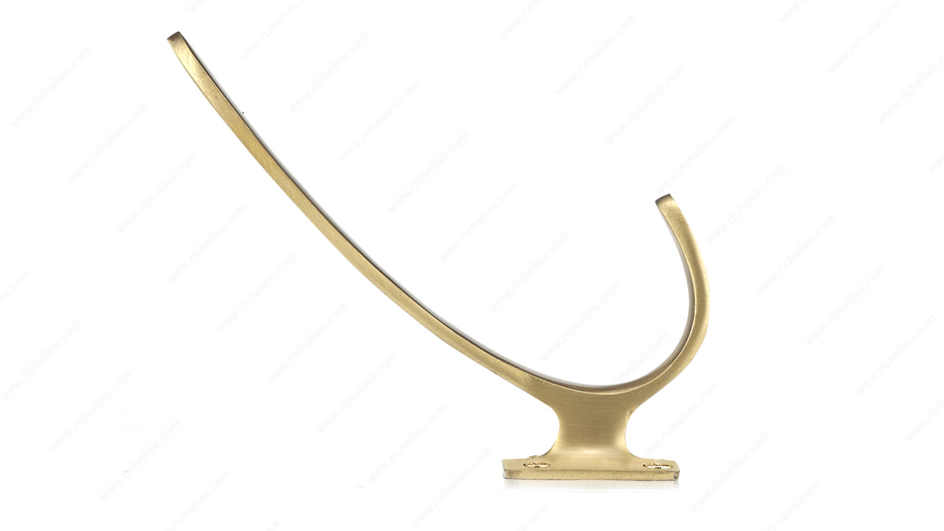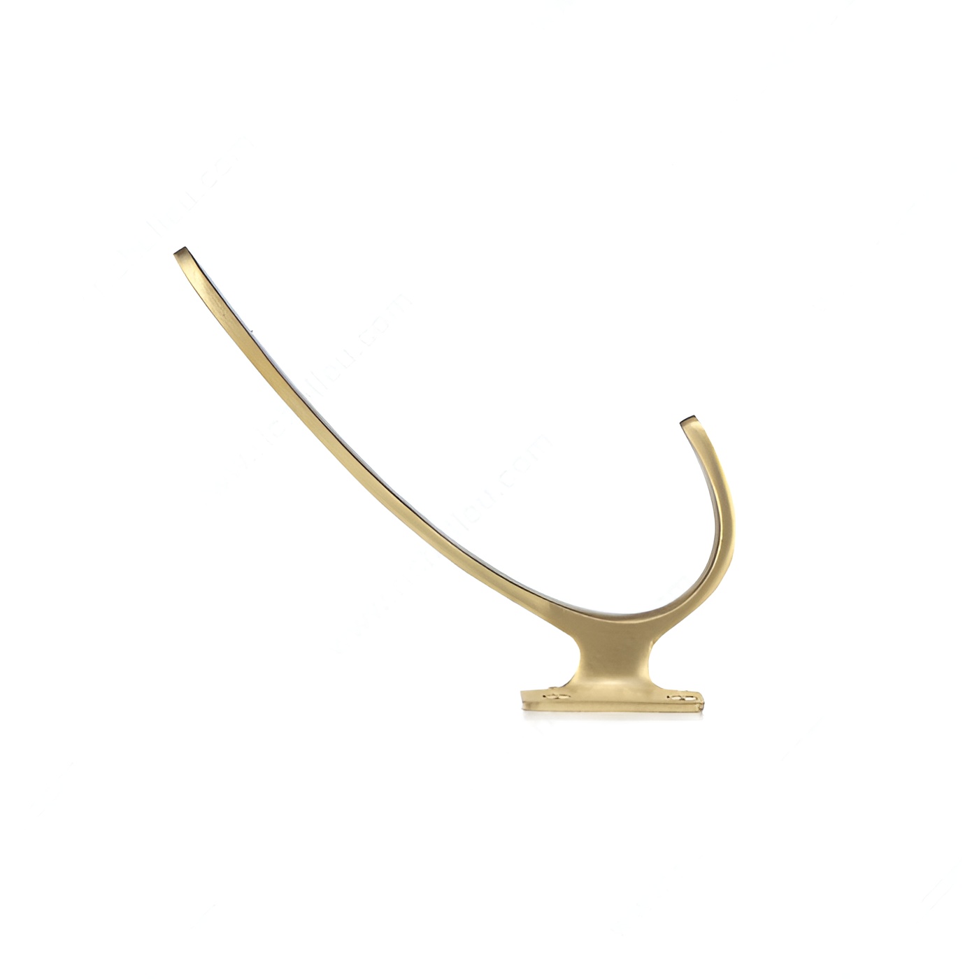 Richelieu T6216160 Modern Metal Hook - 6216 is an elegant addition to any contemporary space, effortlessly combining functionality with style. Designed with a fluid aesthetic, this double hook not only enhances your décor but also helps keep your environment organized. The brushed brass finish, complemented by vibrant yellow accents, brings a touch of warmth to your room while maintaining a sleek modern look. Measuring 4 17/32 inches in height and 1 3/8 inches in width, the hook offers ample space for hanging a variety of items, from coats to bags. With a projection of 3 17/32 inches, it provides convenient access without intruding on your living area. The hook's robust metal construction ensures a load capacity of up to 22 pounds, making it both practical and reliable for daily use. Installation is straightforward, as the necessary screws are included with your purchase. With a center-to-center measurement of 7/8 inch, this hook is versatile enough to fit various mounting options. Whether you’re looking to declutter your space or elevate your interior design, the Richelieu T6216160 Modern Metal Hook is the perfect choice for those who appreciate quality and style in their home accessories.