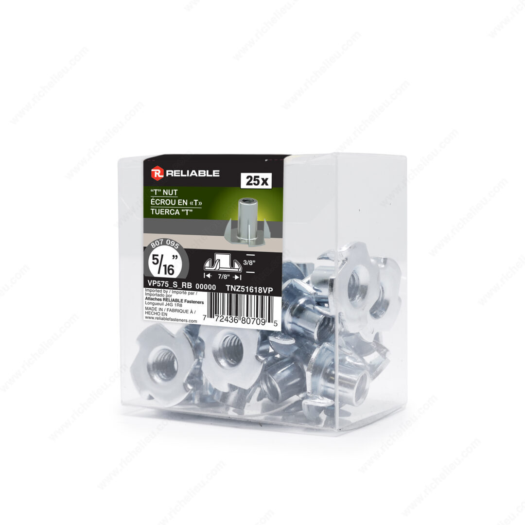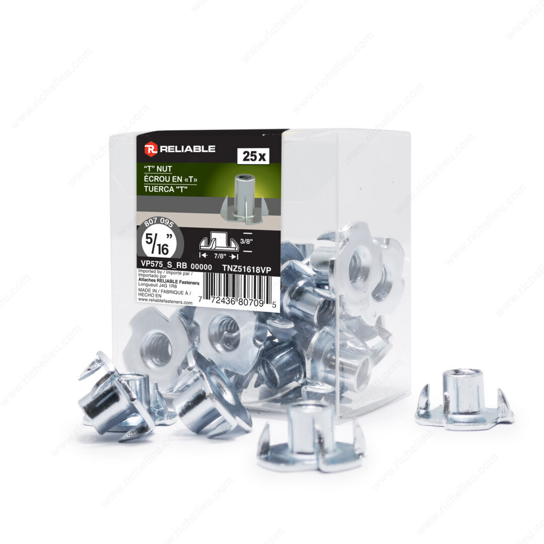 Richelieu TNZ51618VP T-nut with Four Prongs - Zinc is an essential component for structure assembly, expertly designed to provide reliability and strength in various applications. Crafted from durable steel and finished with a protective zinc coating, these T-nuts ensure long-lasting performance while resisting corrosion. With a barrel length of 3/8 inch and a bolt diameter of 5/16 inch, the TNZ51618VP is perfectly sized for compatibility with standard hardware, making it an ideal choice for both professional builders and experienced DIY enthusiasts. The four-prong design enhances grip, allowing for secure fastening and stability in your assemblies. This T-nut features a thread count of 18, ensuring a precise fit and efficient assembly. Packaged in boxes of 25, these nuts are convenient for larger projects or multiple installations. Suitable for shipping via UPS, you can easily incorporate them into your supply chain. Whether you're working on cabinetry, furniture, or other structural projects, the Richelieu TNZ51618VP T-nut offers the strength and reliability you need to achieve professional results. Trust in Richelieu’s commitment to quality and performance to elevate your building projects.