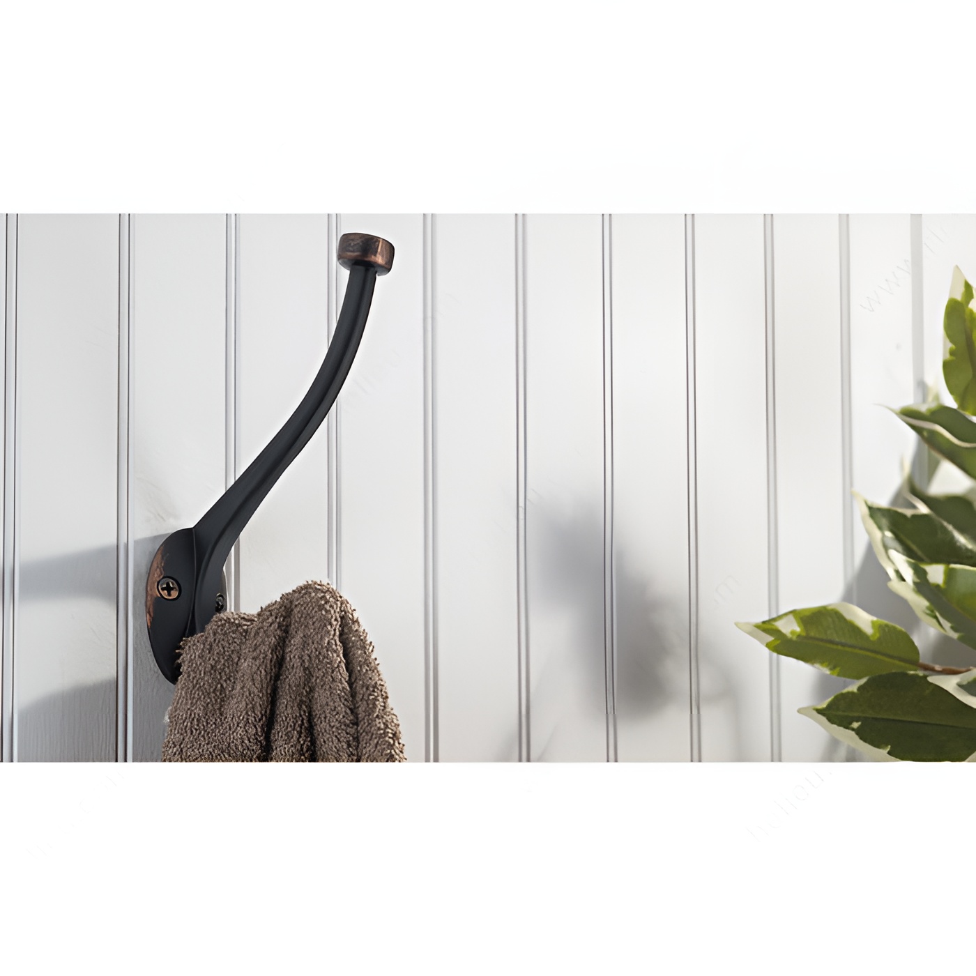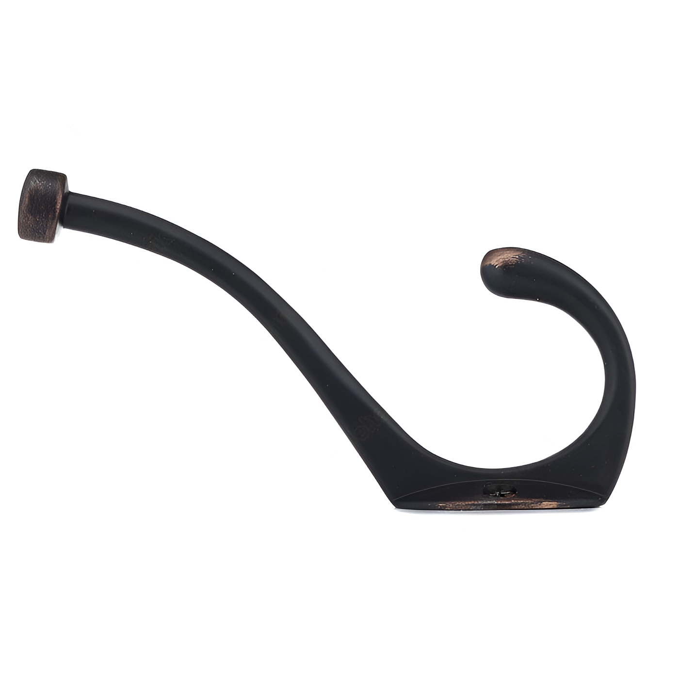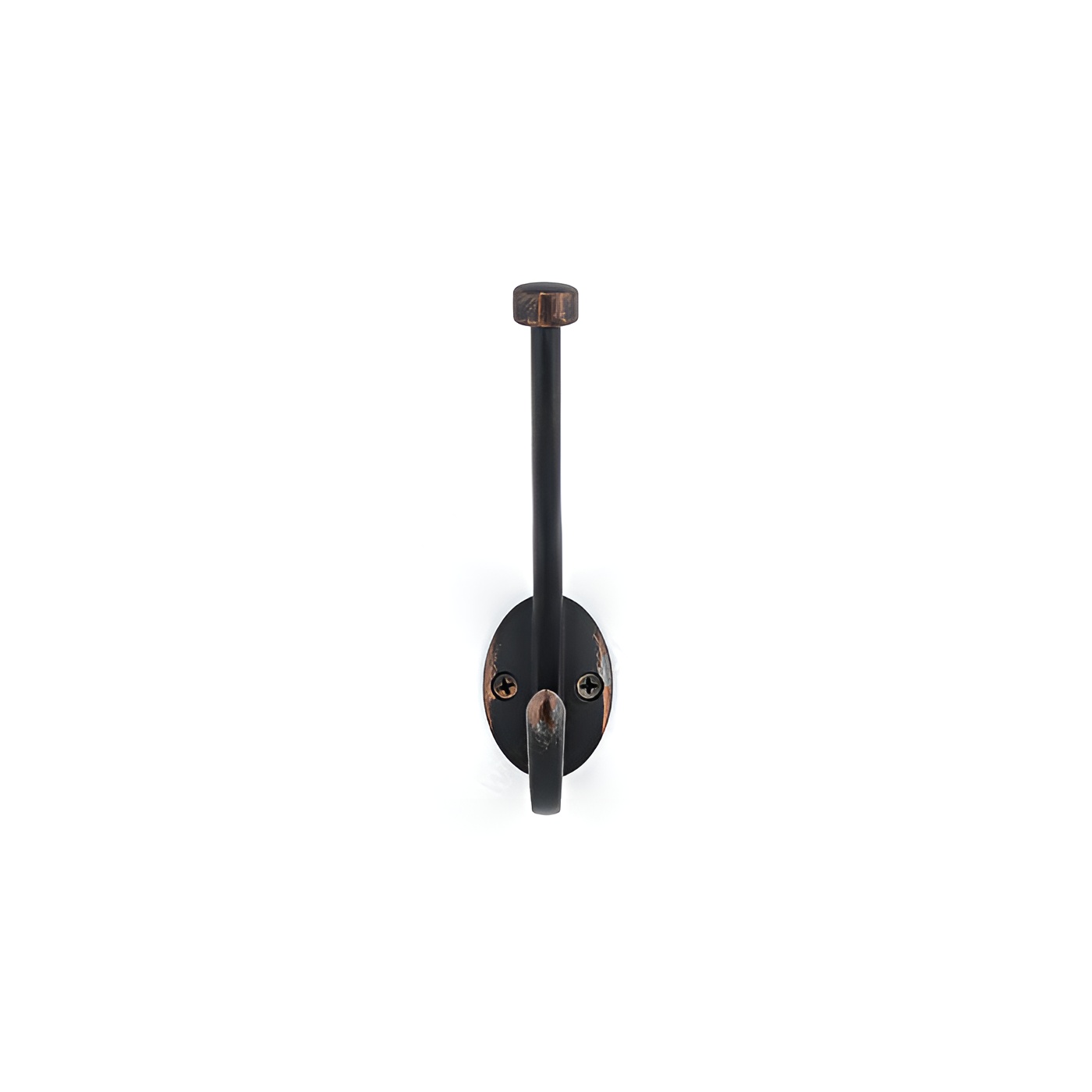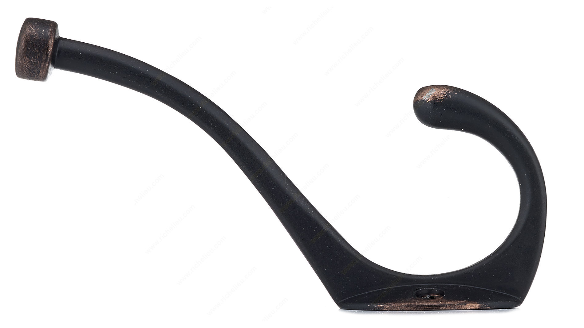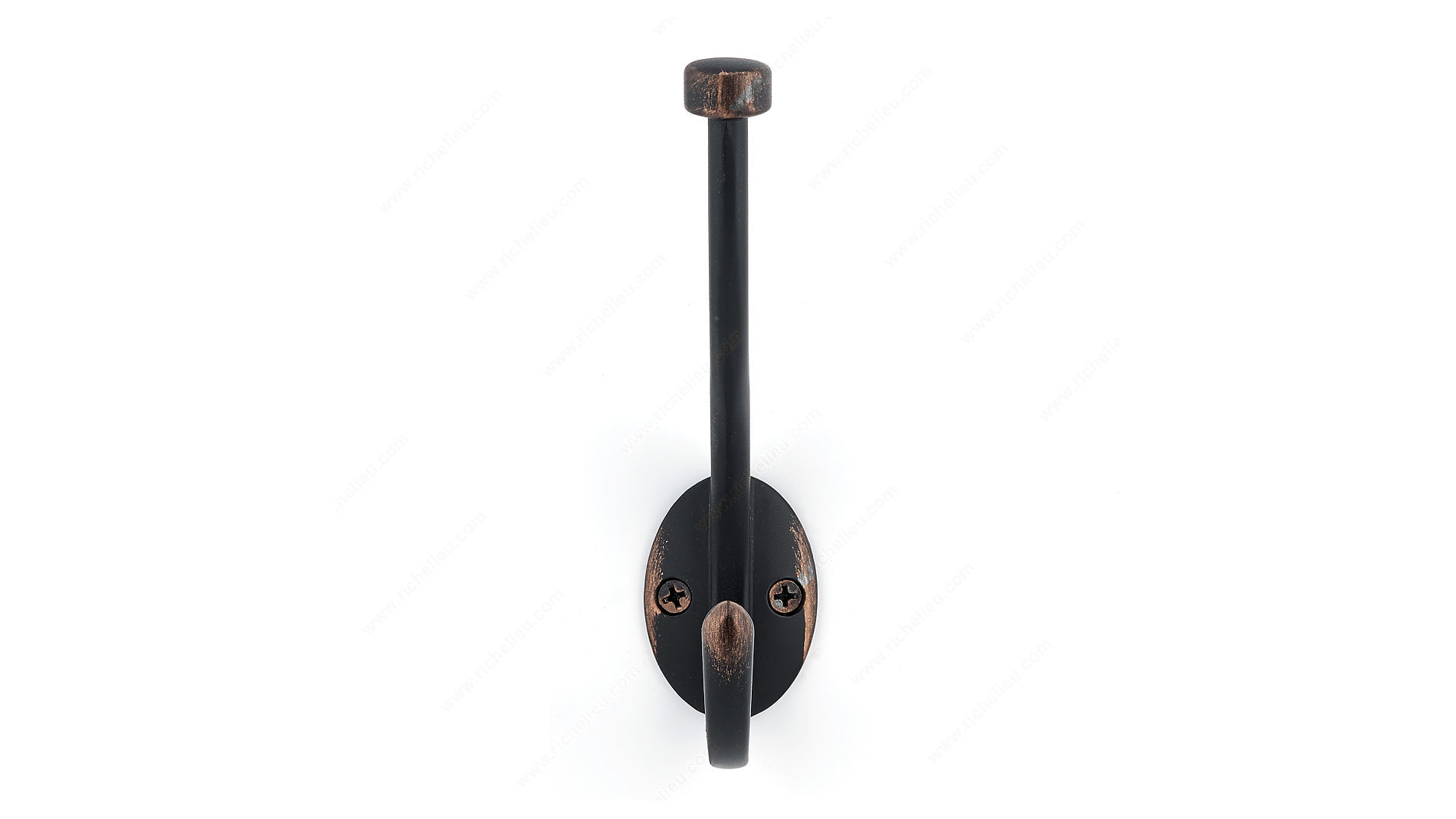 Richelieu NH026200BORB Transitional Metal Hook - 026 offers a sophisticated storage solution that seamlessly blends style and functionality. Finished in a brushed oil-rubbed bronze, this dual-arm coat hook enhances the aesthetic of any room while providing ample support for your belongings. With an overall height of 5 13/16 inches and a width of 1 7/16 inches, the hook's compact design allows for versatile installation on walls or doors, making it an ideal addition to bedrooms, bathrooms, entryways, mudrooms, and closets. The transitional style of the NH026200BORB hook features a ball end on the top hook, ensuring that clothes and other items hang securely and without slipping. It boasts a remarkable load capacity of 22 pounds, accommodating a variety of garments and accessories with ease. The center-to-center measurement of 7/8 inch allows for convenient placement alongside other hooks when needed. Each hook is packaged in a blister format and comes with included wood screws for simple installation. Elevate your organization while adding a touch of refinement to your space with the Richelieu NH026200BORB Transitional Metal Hook - 026, where form meets practicality.