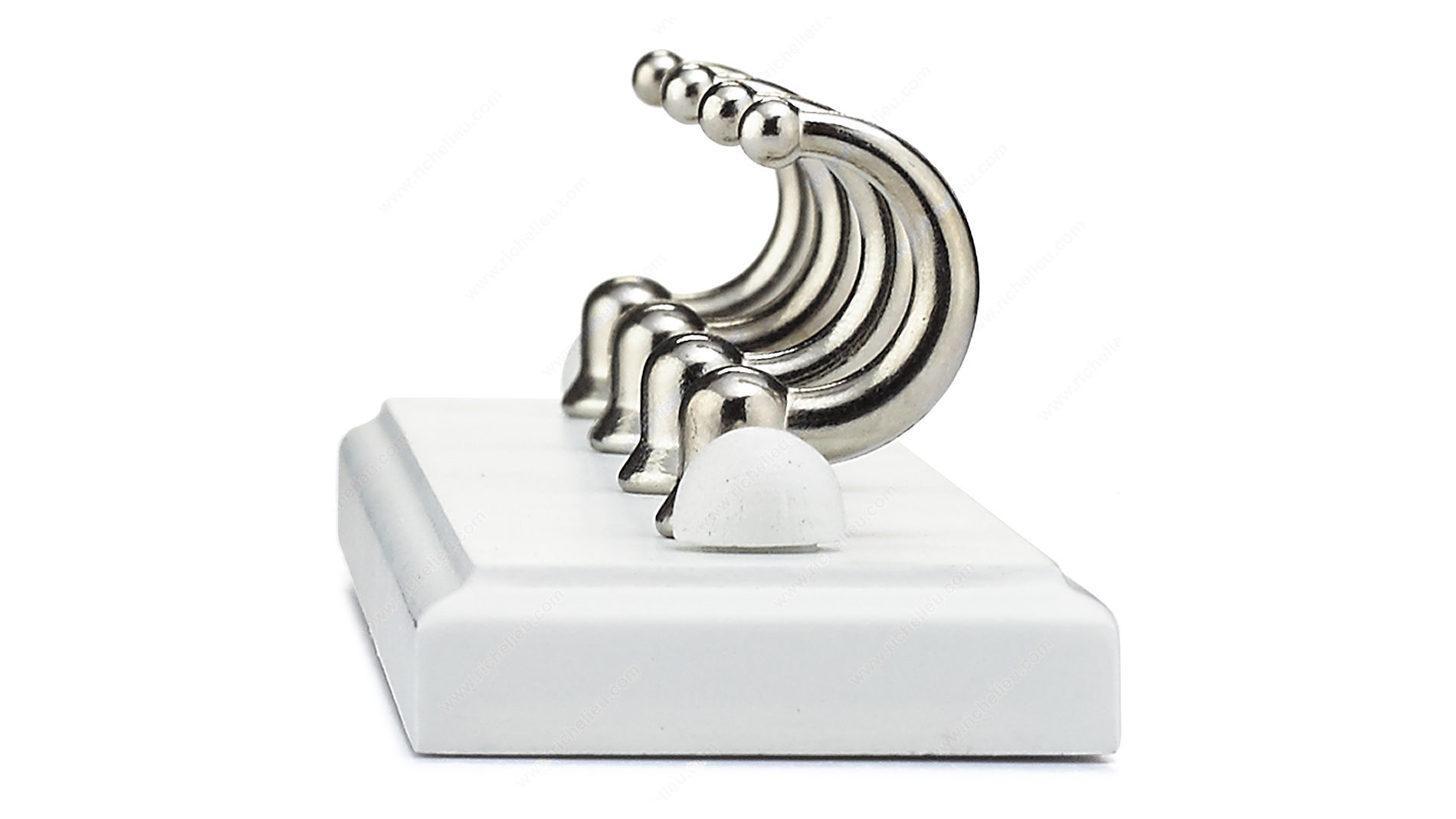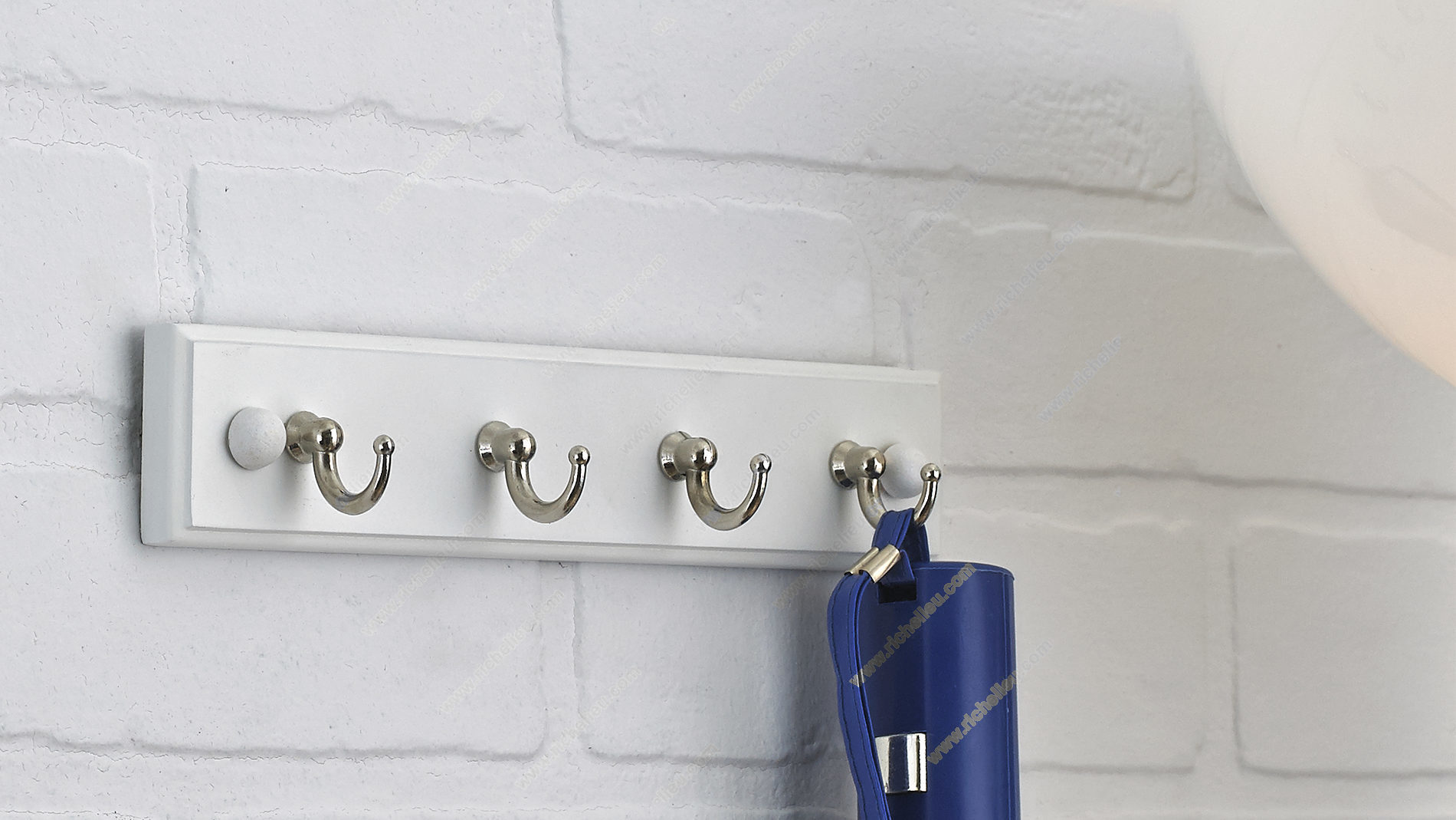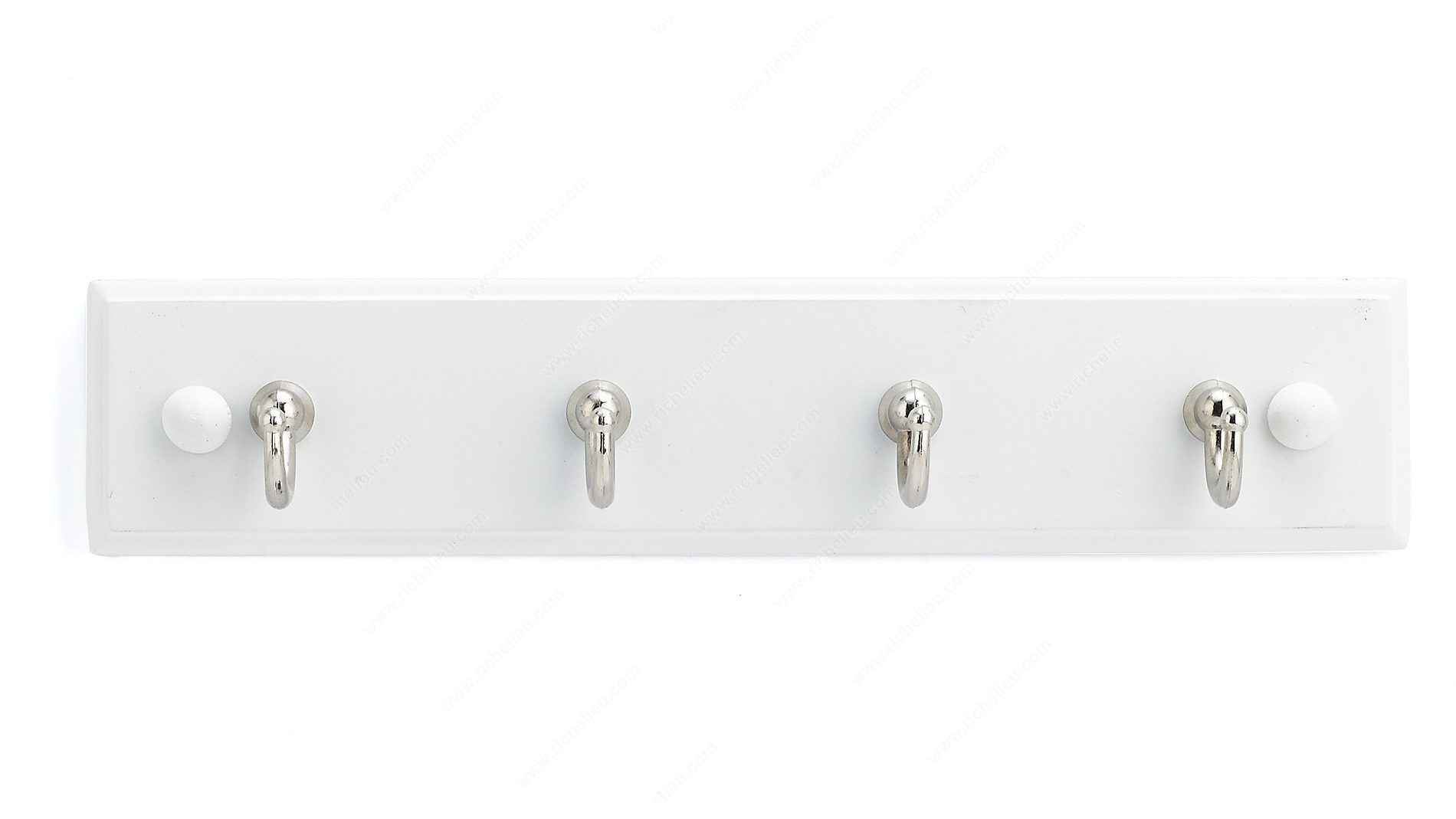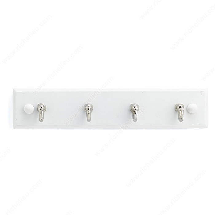 Richelieu 35121 Utility Key Hook - 35 combines functionality with contemporary design to enhance your entryway or any space in your home. This stylish key rack features four utility hooks affixed to a sleek white board, providing a warm touch that complements various decor styles. Crafted from high-quality metal and wood, this key hook is durable enough to handle everyday use while maintaining its aesthetic appeal. With a load capacity of 2.2 lbs per hook, it is perfect for hanging keys, accessories, or other lightweight items, making it a versatile addition to bedrooms, bathrooms, closets, and more. The chrome and white finish offers a modern contrast that adds elegance to your walls or doors. Measuring 8 5/8 inches in width, 1 25/32 inches in height, and with a projection of 1 21/32 inches, the compact design fits seamlessly into any space without overwhelming it. Installation is straightforward, with screws and nails included for your convenience. Elevate your organizational game with the Richelieu 35121 Utility Key Hook - 35, where style meets practicality, ensuring you'll always find your keys in a snap.