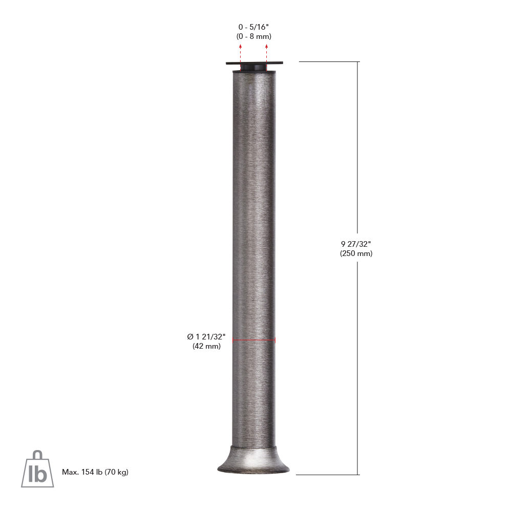 Richelieu 64130250170 Vintage Round Legs - 641 enhance the aesthetic of any furniture, closet, or storage piece with their charming vintage appeal. Crafted from durable aluminum, these legs are designed to provide both style and stability, supporting a load capacity of 154 lbs per leg. With a base diameter of 2 25/32 inches and a leg diameter of 1 21/32 inches, these legs offer a robust foundation while maintaining an elegant profile. Available in three heights and finishes, the Vintage Round Legs cater to diverse design preferences and installation needs. The adjustable feature allows for height modification up to 5/16 inches, ensuring a perfect fit for various furniture styles. Installation is straightforward, making it easy for building professionals and knowledgeable homeowners alike to incorporate them into their projects. The sleek stainless steel finish not only adds a touch of sophistication but also ensures longevity and resistance to wear. With plate dimensions of 55 mm x 55 mm, these legs provide a sturdy attachment point, ensuring your furniture remains secure and stable. Elevate your furnishings with Richelieu's Vintage Round Legs, where functionality meets timeless design.