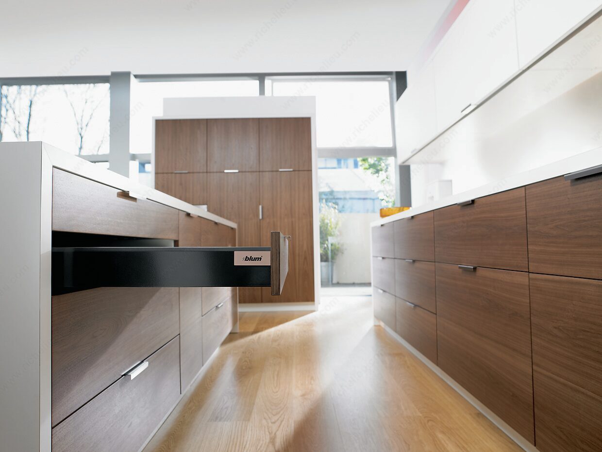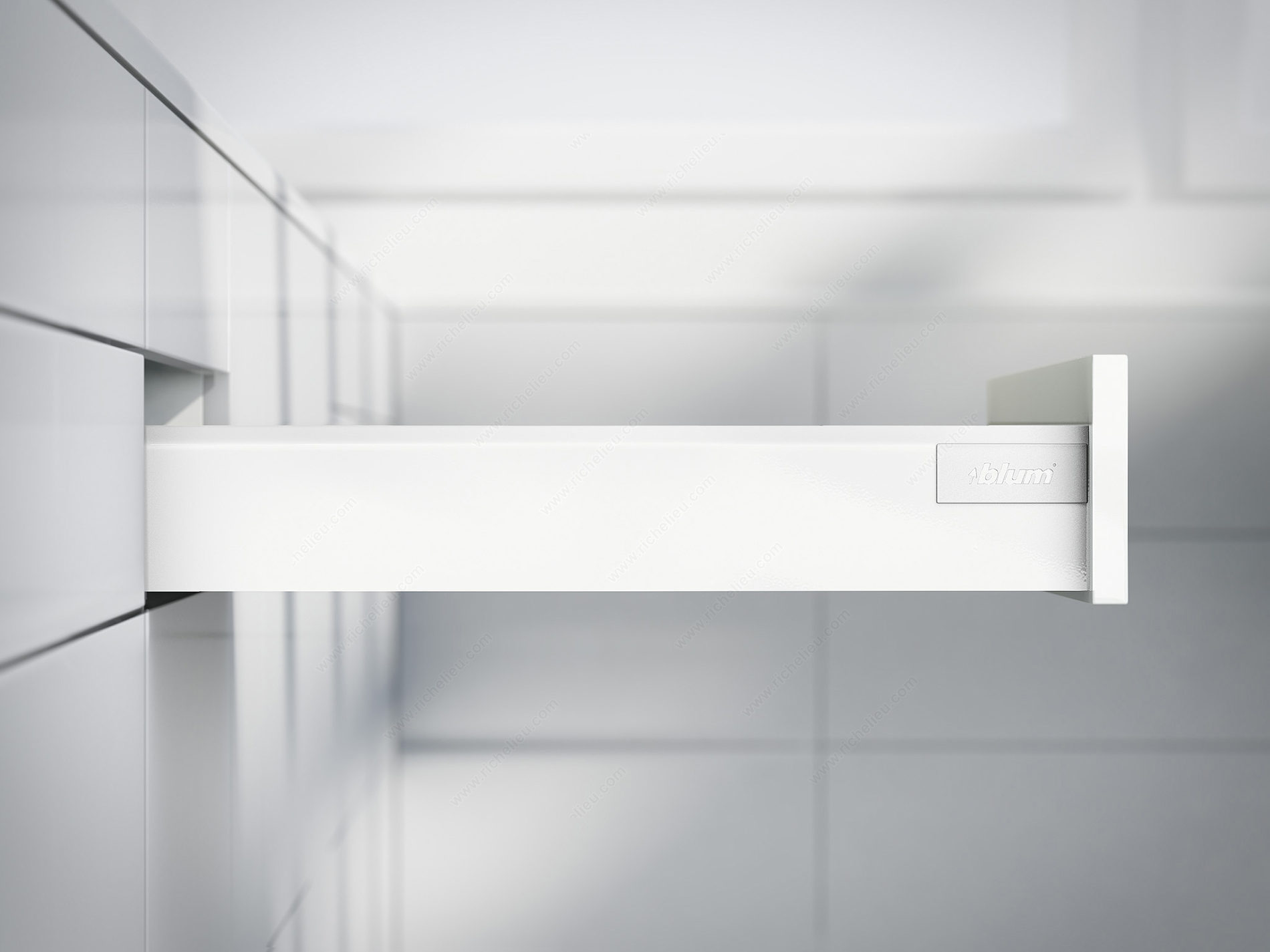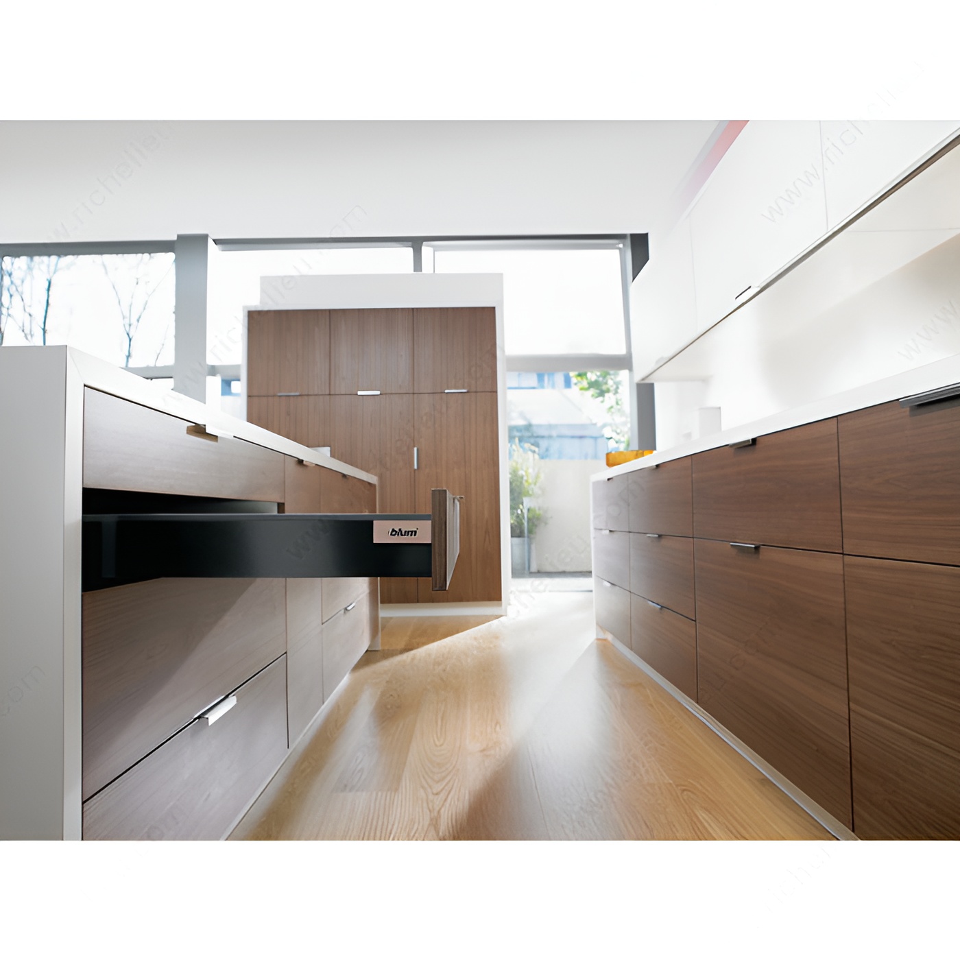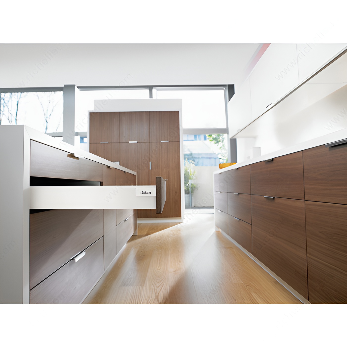 Richelieu WEBKIT1211079 Standard Drawer - M (83 mm) offers a perfect blend of functionality and modern design, ideal for any frameless cabinet setup. This drawer side is compatible with both TANDEMBOX Antaro and TANDEMBOX Intivo systems, ensuring a seamless integration into your cabinetry. With a sleek, straight line design, it enhances the aesthetic of your space while providing practical storage solutions. The drawer measures 13 3/4 inches in length and depth, with a height of 3 9/32 inches, making it a versatile choice for general storage needs. Constructed from durable metal, the WEBKIT1211079 supports a load capacity of up to 66.1 lbs, accommodating a variety of items. The full extension undermounted slides allow for easy access to contents, and the push-to-open motion technology adds a touch of convenience, eliminating the need for handles. Finished in a sophisticated light gray, this standard drawer complements contemporary interiors while maintaining a professional appearance. Whether you're outfitting a new kitchen or upgrading existing cabinetry, Richelieu's WEBKIT1211079 Standard Drawer provides the quality and style that discerning builders and homeowners demand. Enjoy the harmony of form and function with this exceptional product.