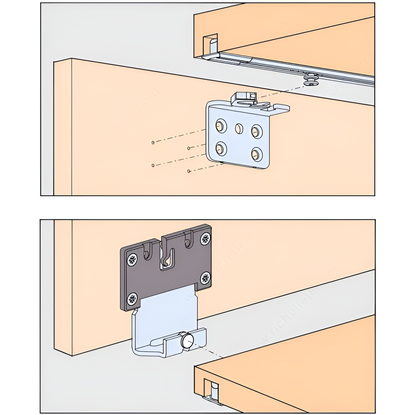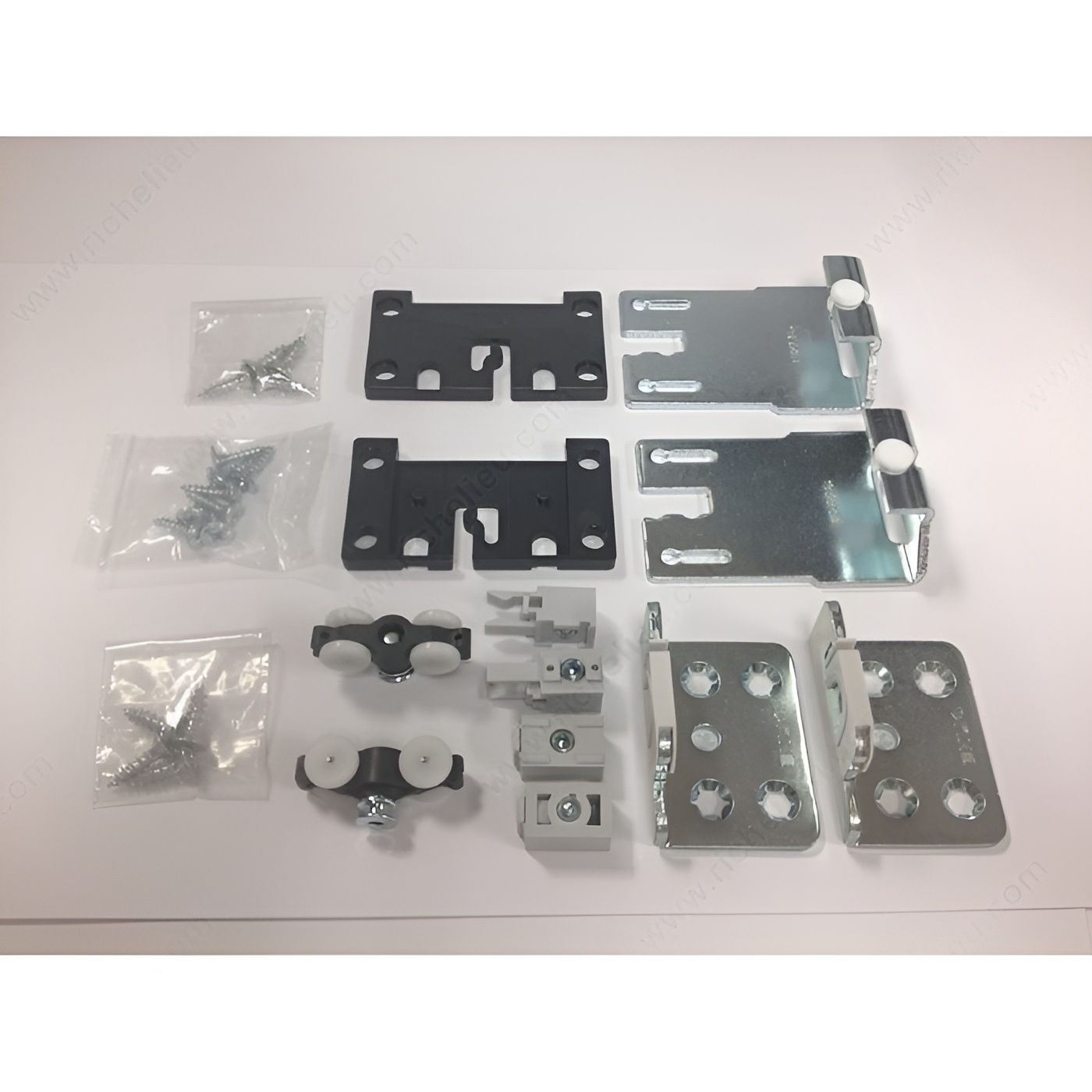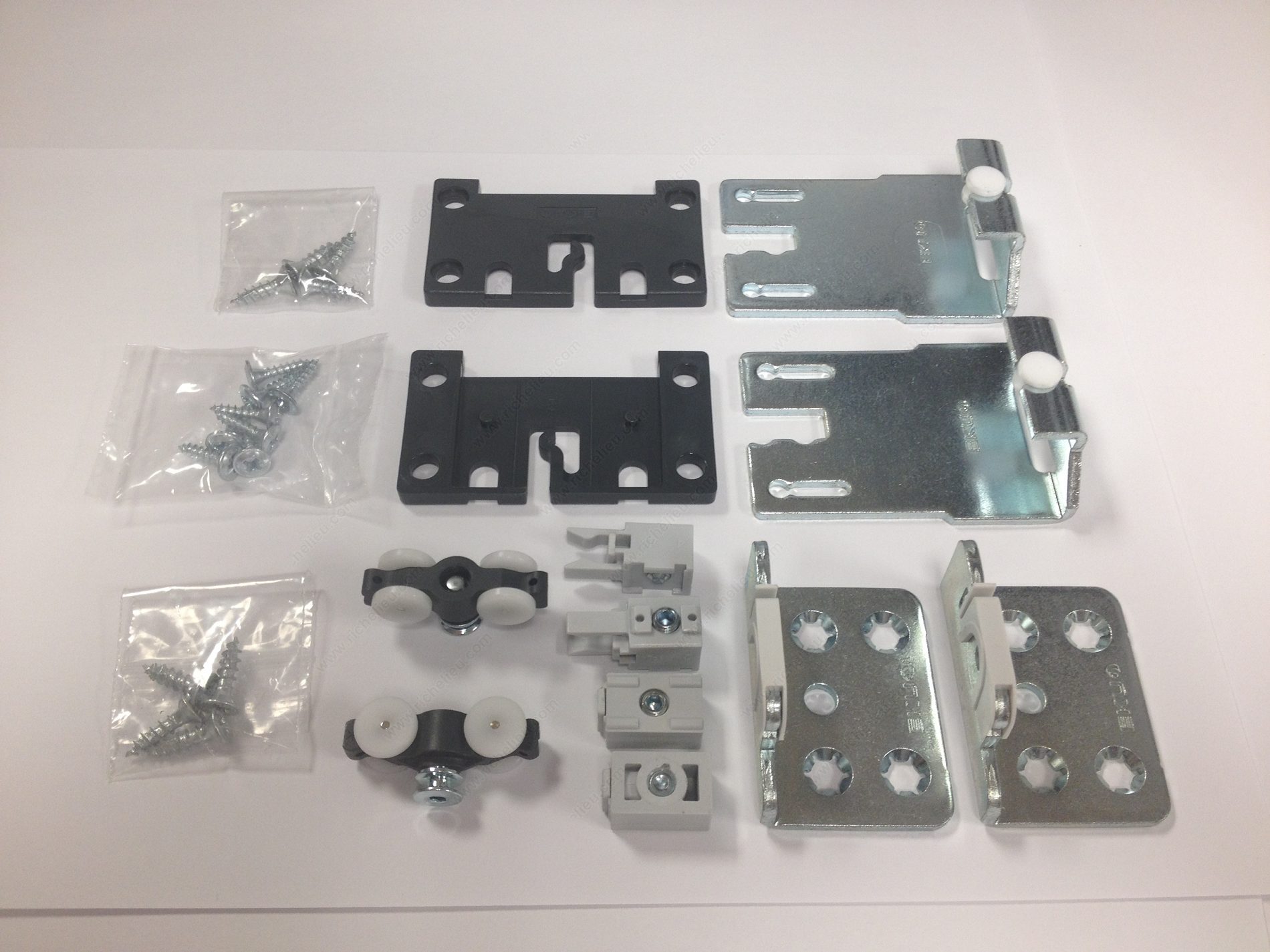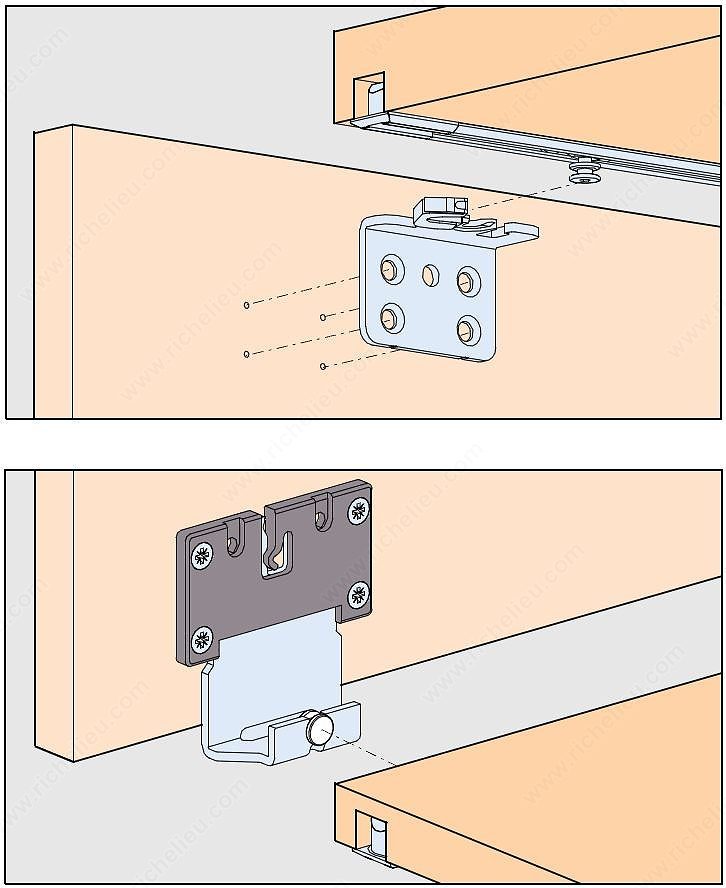 Richelieu WEBKIT1213525 HAWA CLIPO 16 H FS Full Overlay Sliding Cabinet Door System offers a sophisticated solution for modern cabinetry. This top-running sliding system supports a single wood door weighing up to 35 lb (16 kg), making it ideal for full overlay applications. The clever design features four guiding points and seamlessly integrates into your furniture or cabinet setup. The upper running gear and lower guide wheels are discreetly clipped into housings mounted at the back of the door, ensuring a clean and unobtrusive appearance. The tracks are recessed internally within the top of the cabinet and externally at the bottom, allowing for a streamlined aesthetic. For an added touch of luxury, an optional soft-close mechanism can be purchased separately, enhancing user experience. Designed for doors with a maximum height of 55 1/8 inches and a width of up to 39 3/8 inches, the system accommodates wood doors with a minimum thickness of 5/8 inches. The satin aluminum finish not only provides durability but also complements various design styles. With its upper roller position and axle bushing type roller, the HAWA CLIPO 16 H FS ensures smooth and reliable operation-perfect for both residential and commercial applications.