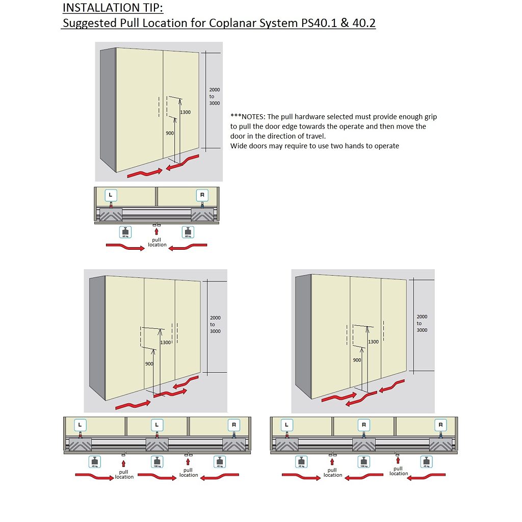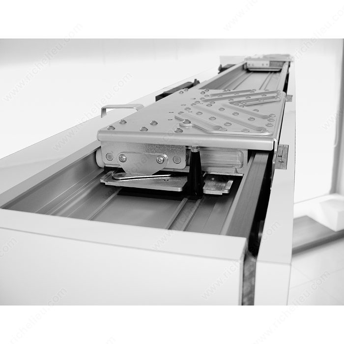 Richelieu WEBKIT1214147 CINETTO PS40.2 Coplanar Sliding SystemRichelieu WEBKIT1214147 Cinetto PS40.2 Coplanar Sliding System offers an innovative solution for large cabinet doors, accommodating weights of up to 132 lb (60 kg) each. This flexible system can seamlessly handle one, two, or three wood doors, making it ideal for various applications such as wardrobes, pantries, and large storage millwork in both residential and commercial environments. Engineered for convenience, the Cinetto PS40.2 features adjustable surface mount hardware and comes with a soft-close mechanism, ensuring a smooth and quiet operation. Its design requires no special cabinet fabrication, simplifying installation. The system is available in two elegant track finishes-silver and stainless steel effect anodized aluminum-allowing for versatility in design aesthetics. The product supports door widths ranging from 35 to 70 7/8 inches and accommodates heights up to 9 feet 10 inches, making it suitable for larger spaces. It is crucial to use a door straightener or stiffener to enhance the rigidity of the doors. With a load capacity that ranges between 99.2 to 220 lb, the Richelieu Cinetto PS40.2 is a robust choice for those seeking functionality without compromising style.