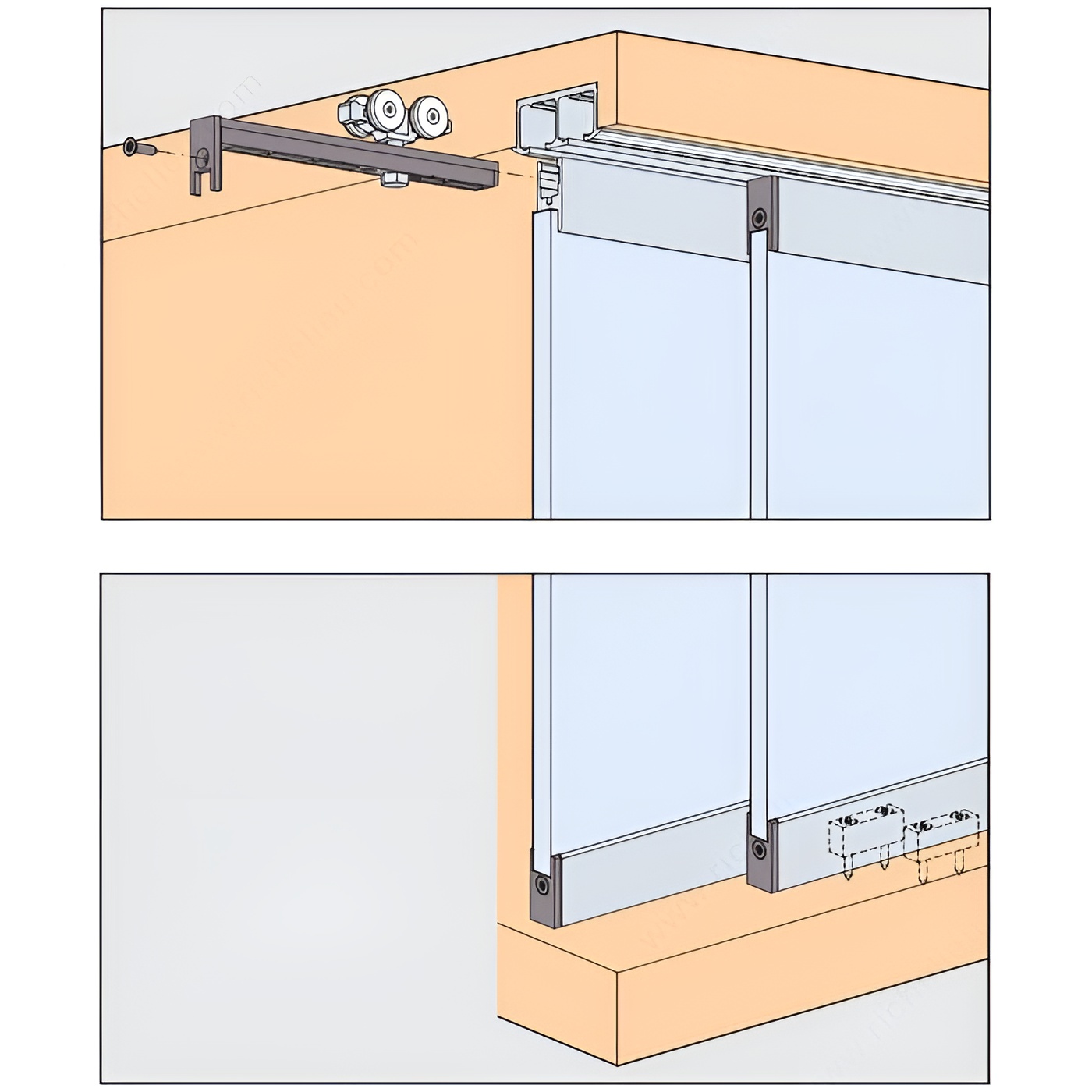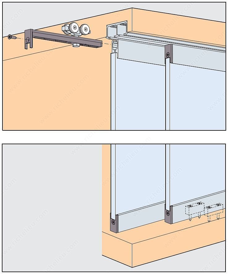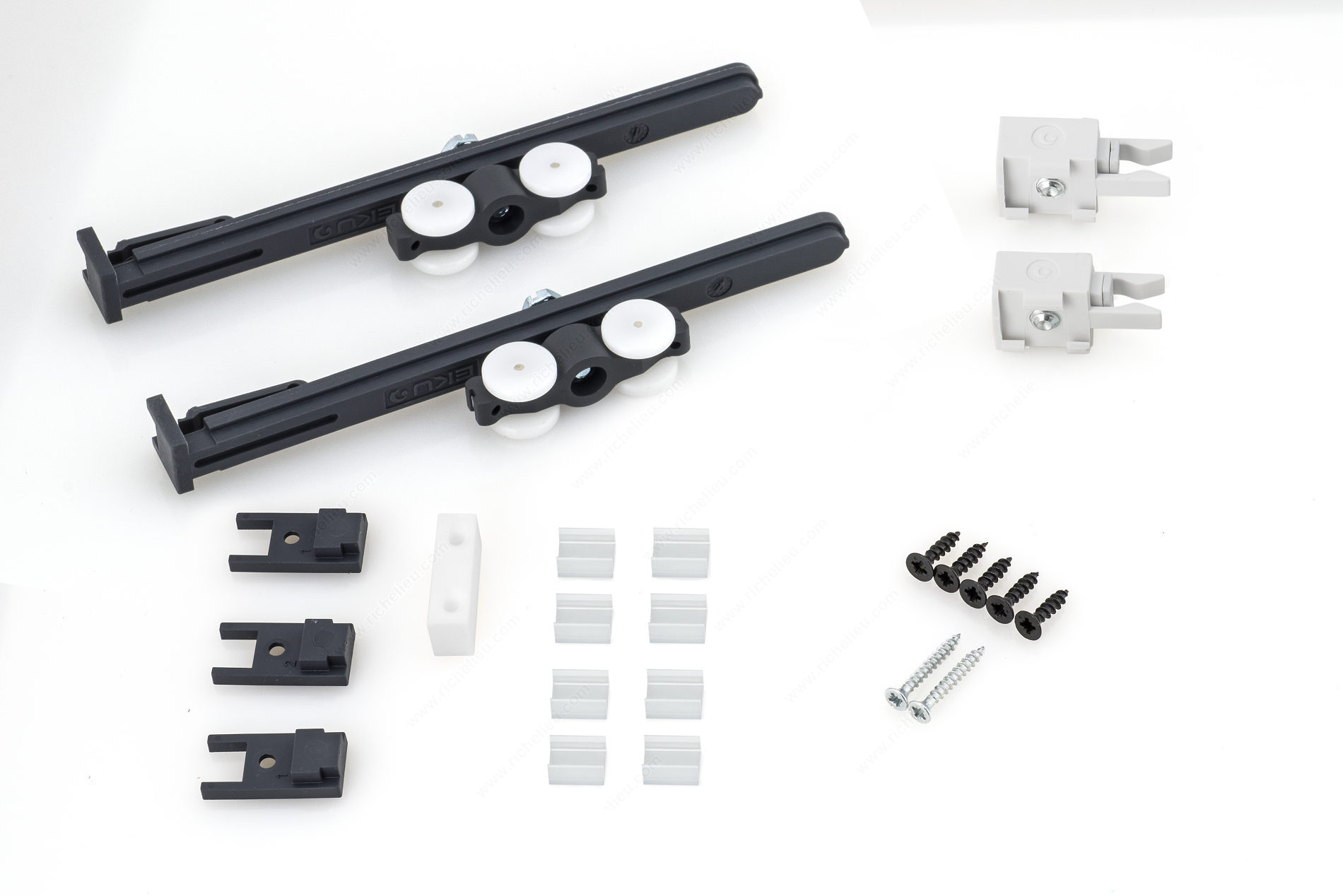 Richelieu WEBKIT1214313 HAWA Clipo 36 GPPK IS Bypassing Sliding System for Inset Glass Cabinet Doors offers a sophisticated solution for modern cabinetry. Designed to accommodate glass cabinet doors weighing up to 77 lb (36 kg), this top-running sliding system is perfect for inslide and inlay applications, providing both functionality and style. The frameless design features a low-profile aluminum extrusion at the top, ensuring a sleek appearance, while a modest floor mount guide provides essential lateral support at the base of the door. With versatile top track options available for single or double track applications, you can choose to recess or surface mount to fit your specific cabinet design. This system supports doors with a maximum height of 78 ¾ inches and a thickness ranging from ¼ to 5/16 inches. It accommodates door widths between 11 ¾ to 39 3/8 inches, making it adaptable to various configurations. The satin aluminum finish enhances its aesthetic appeal, while the optional soft-close mechanism (sold separately) adds a touch of luxury to its operation. Ideal for wardrobes, pantries, and showcases, the Richelieu HAWA Clipo system combines practicality with elegance, ensuring your space remains both functional and stylish.