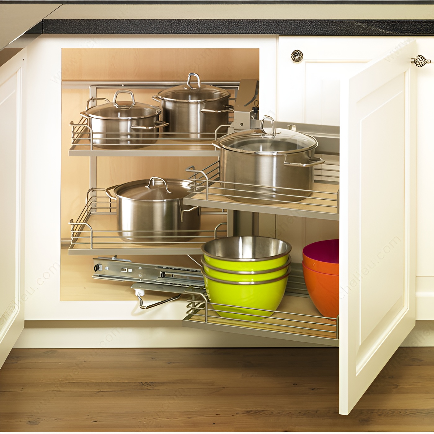Richelieu WEBKIT1214419 Magic Corner Arena US offers an innovative solution for optimizing corner storage in both framed and frameless cabinets. This expertly designed system features a beautiful Maple/Champagne finish that complements a variety of kitchen styles, adding a touch of elegance to your space. To ensure a perfect fit, the Magic Corner requires specific interior dimensions: a minimum depth of 21 9/16 inches, a height of 21 1/16 inches, and a width ranging from 38 9/16 to 43 7/8 inches. Designed with convenience in mind, it operates with a right-opening mechanism and accommodates opening widths between 17 3/4 and 23 5/8 inches, making it an ideal choice for maximizing the functionality of corner spaces. The Richelieu Magic Corner is not just about aesthetics; it enhances accessibility, allowing you to make the most of every inch of storage. With easy shipping options available via UPS, this product is practical for both professional builders and discerning homeowners. Transform your kitchen into a model of efficiency and style with the Richelieu WEBKIT1214419 Magic Corner Arena US, where design meets functionality seamlessly.