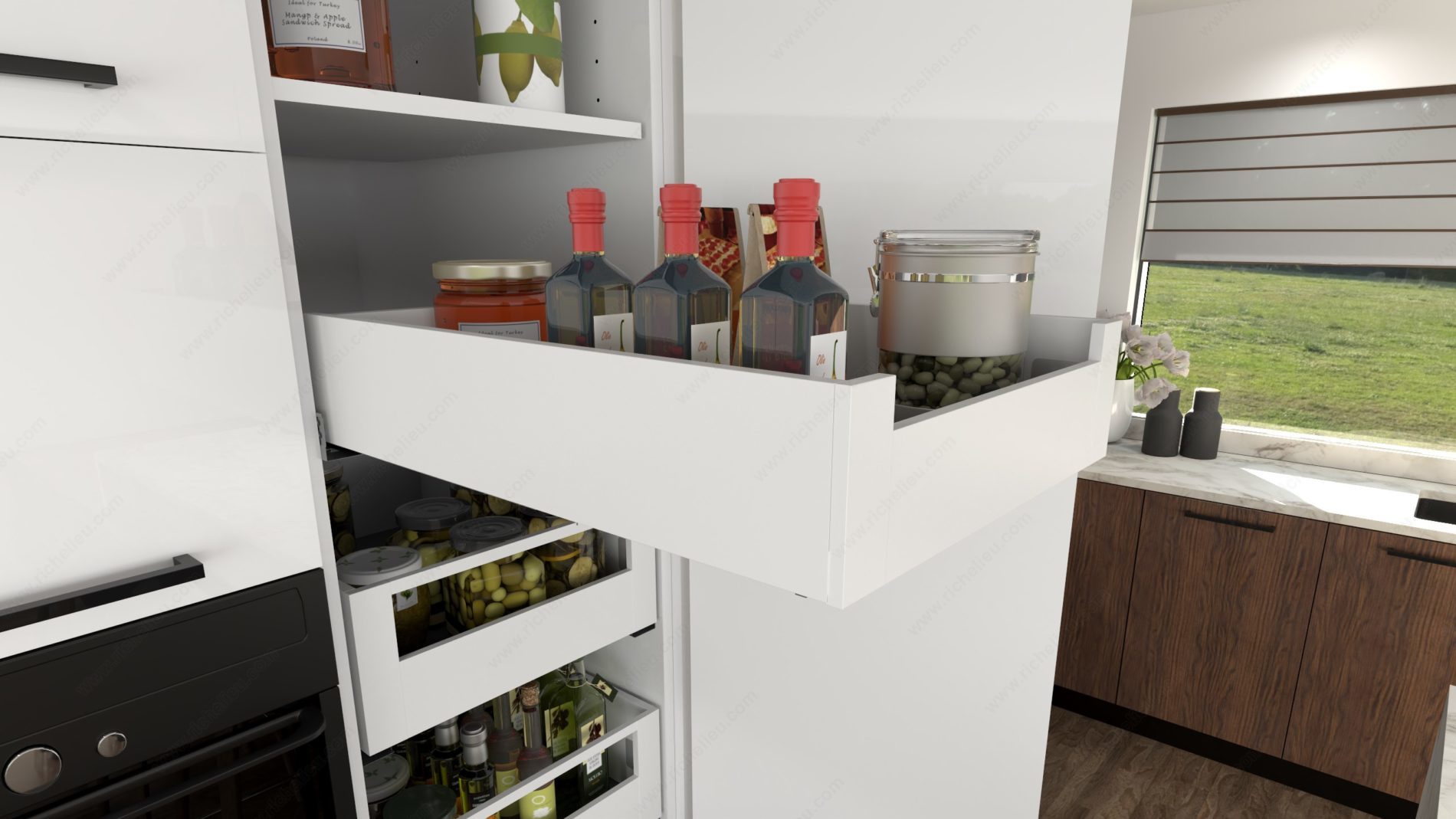 Richelieu WEBKIT1215801 OPTIMIZ-R 121 mm - Set for Inner Drawers offers a cutting-edge solution for maximizing storage space in your cabinetry. Designed with slim double wall panels, this metal drawer system combines functionality with a sleek aesthetic. The OPTIMIZ-R is tailored for roll-out applications, providing users with easy access to stored items while maintaining a clean look. Featuring a soft-close motion technology, this drawer system ensures a smooth and quiet closure, enhancing the overall experience in your kitchen or workspace. When paired with Richelieu's 828 Concealed Synchronized Slides, the drawer achieves optimal performance, allowing for full extension and seamless use. Constructed from durable steel with a crisp white finish, the WEBKIT1215801 supports a significant load capacity of up to 99.2 lbs, making it ideal for various storage needs. Adjustments can be made in four different ways-height and lateral-ensuring precise fitting. This product is available for purchase in sets of ten and ships conveniently via UPS. With dimensions of 19 5/8 in length and 4 3/4 in height, the OPTIMIZ-R drawer system is a reliable choice for those seeking both style and efficiency in their cabinetry solutions.