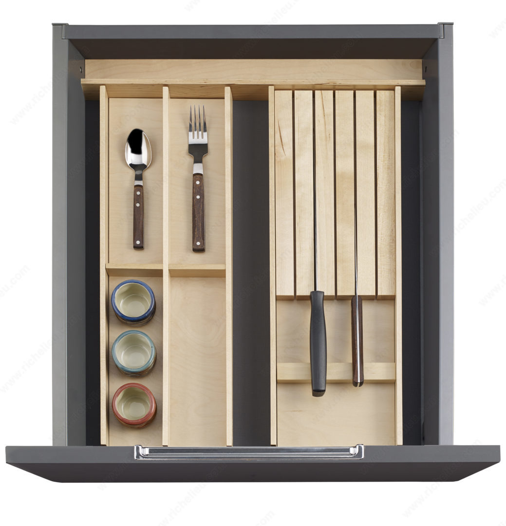 Richelieu WEBKIT1216954 Portland - Complete Set of Drawer Dividers offers an exceptional blend of functionality and aesthetic appeal. Designed with clean, contemporary lines, this set transforms your drawers into organized spaces, allowing for a clear overview and easy access to all contents. Within minutes, you can customize your drawer setup, making it ideal for both residential and professional environments. With an interior drawer depth of 16 3/4 inches, the dividers are suitable for drawers ranging from 12 to 15 1/2 inches in width, ensuring compatibility with various drawer sizes. The product height of 1 11/16 inches provides ample space for organizing items without crowding. The option to omit the horizontal extension for installation depths of 424 mm (16 3/4 inches) further enhances installation flexibility. Crafted in a birch finish, the dividers not only serve a practical purpose but also add a touch of elegance to your storage solutions. Whether you're looking to streamline your kitchen, office, or workshop, the Richelieu Portland drawer dividers stand out as a sophisticated choice for effective drawer organization. Easy to install and versatile, they cater to the needs of builders and discerning homeowners alike.
