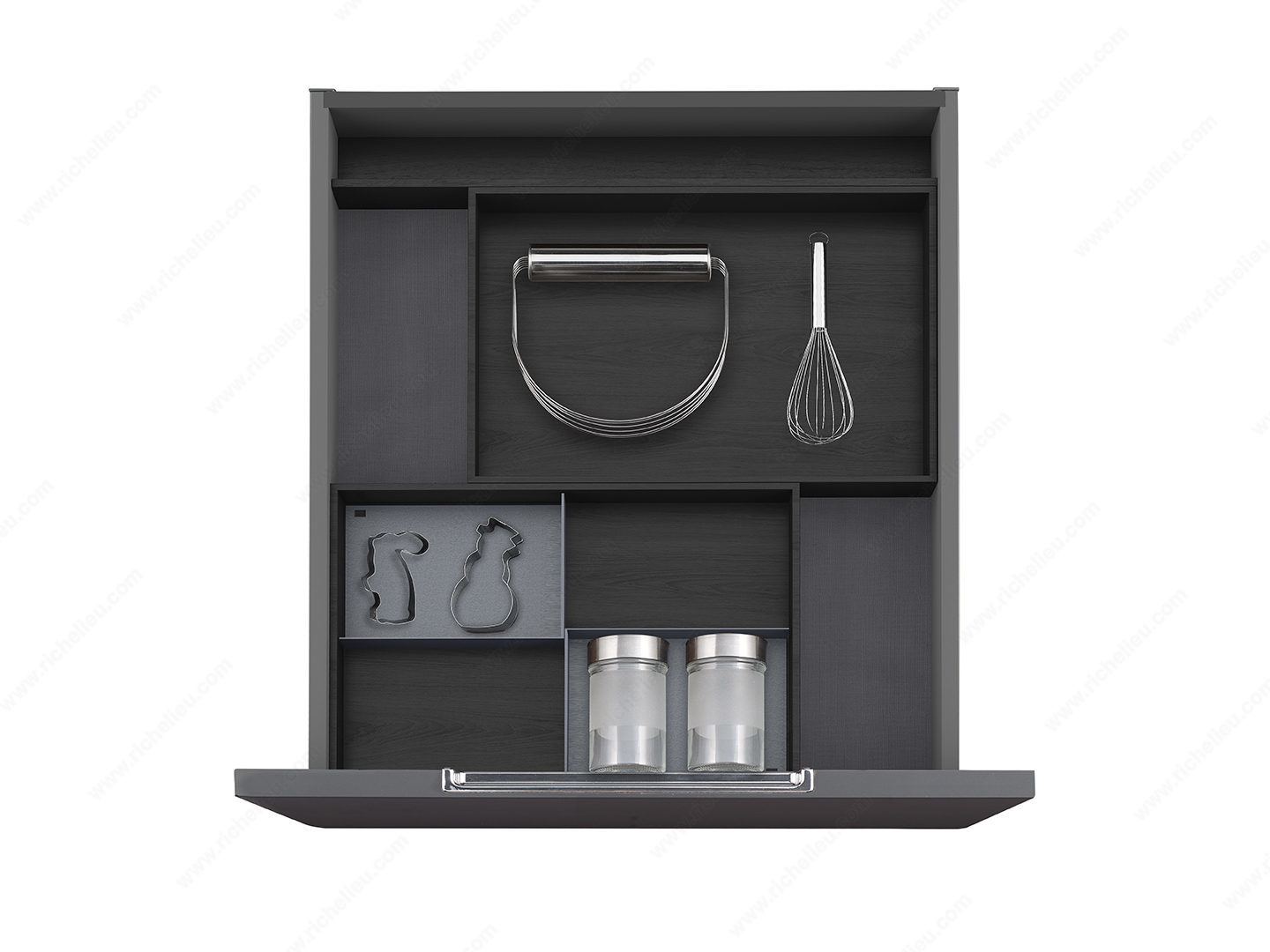 Richelieu WEBKIT1217149 Sydney - Complete Set of Drawer Dividers offers an elegant solution for drawer organization, merging functionality with modern design. With its sleek Black Ash finish, this complete set features optimally arranged components designed to enhance the efficiency of your storage space. Installation is a breeze, allowing you to achieve a neat and organized drawer in just minutes. The dividers accommodate interior drawer depths ranging from 18 1/4 to 20 7/8 inches and widths between 12 and 21 5/8 inches, making them versatile enough for various drawer sizes. Notably, the horizontal extension is unnecessary for installations with a depth of 424 mm (16 3/4 inches), streamlining the setup process even further. Measuring at a height of 1 11/16 inches and a width that spans from 11 3/4 to 21 5/8 inches, these dividers neatly fit into your drawer without compromising space. By providing a clear overview of your contents, the Richelieu Sydney dividers facilitate easy access to your items while maintaining a polished appearance. Whether you're a building professional or a knowledgeable homeowner, this set is an essential addition to enhance your storage solutions and keep your drawers impeccably organized.