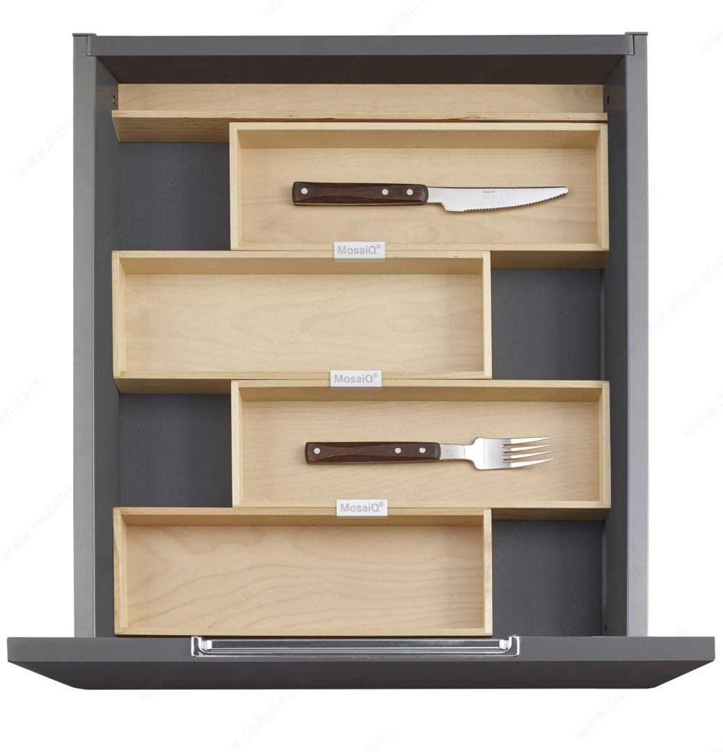 Richelieu WEBKIT1217196 Frankfurt - Complete Set of Drawer Dividers offers an ideal solution for maximizing drawer organization while enhancing aesthetic appeal. Designed with clean, contemporary lines, this complete set helps you achieve a neat and clutter-free environment. The optimally arranged components allow you to sort and access contents with ease, ensuring that everything has its place. This set is compatible with interior drawer depths ranging from 18 1/4 to 20 7/8 inches and widths from 12 to 21 5/8 inches, making it versatile for various drawer sizes. Notably, the horizontal extension (top insert) is not required for installations with a depth of 424 mm (16 3/4 inches), simplifying the installation process. Crafted in a beautiful birch finish, the dividers not only enhance functionality but also add a touch of elegance to any drawer space. Whether you're organizing kitchen utensils, office supplies, or crafting materials, the Richelieu Frankfurt drawer dividers provide a clear overview and easy access, making your daily tasks more efficient. With the added convenience of UPS shipping, upgrading your drawer organization has never been easier. Transform your storage solutions today with this practical and stylish accessory from Richelieu.
