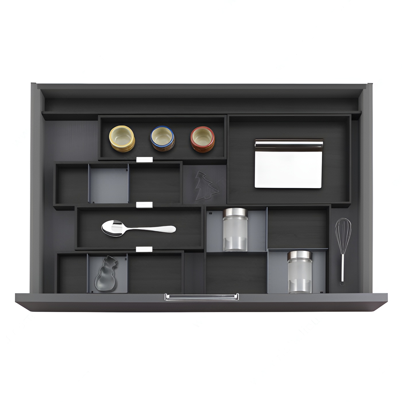 Richelieu WEBKIT1217210 Bogota - Complete Set of Drawer Dividers offers an elegant solution for transforming cluttered drawers into organized spaces. Designed with clean, contemporary lines, this set enhances both functionality and aesthetics. With easy installation, you can achieve a well-arranged drawer in just minutes, ensuring a clear overview and easy access to your essentials. This versatile divider set is suitable for drawers with an interior depth ranging from 18 1/4 to 20 7/8 inches and a width of 23 5/8 to 27 3/8 inches. Notably, the horizontal extension (top insert) is optional for installation depths of 424 mm (16 3/4 in), providing flexibility based on your specific needs. Crafted in a sophisticated Black Ash finish, these dividers complement a variety of interior designs while providing a practical solution to drawer organization. The Richelieu WEBKIT1217210 is an ideal choice for those seeking to maximize storage efficiency without sacrificing style. With the convenience of UPS shipping, you can quickly incorporate these dividers into your home or workspace. Elevate your drawer organization and enjoy the benefits of a tidy, functional environment with this complete set of drawer dividers.
