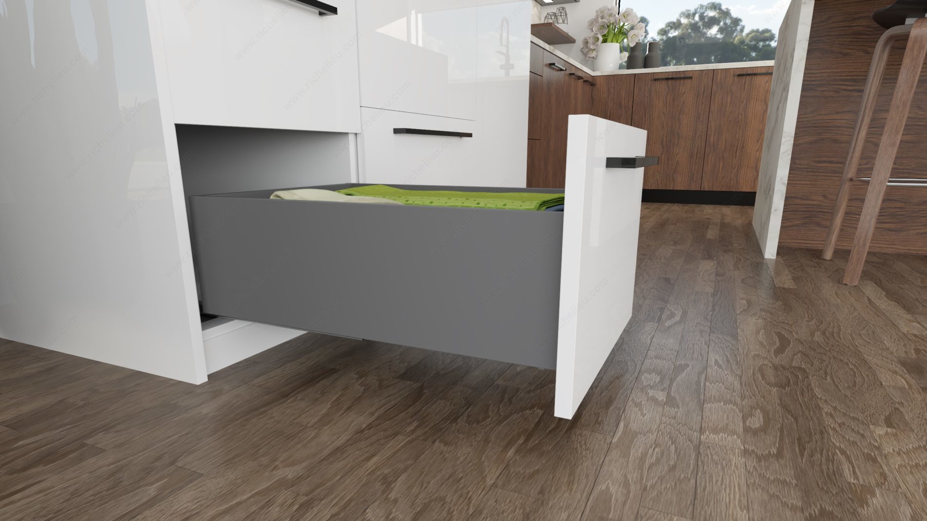 Richelieu WEBKIT1220143 OPTIMIZ-R 185 mm - Set for Standard Drawers offers a modern solution for maximizing storage in your cabinetry. This innovative metal drawer system features slim double wall panels that not only enhance aesthetic appeal but also provide durability and strength. Designed for general storage applications, the OPTIMIZ-R system excels in both functionality and style. One of the standout features of this drawer system is its soft-close motion technology, which ensures a smooth and quiet closing experience when paired with the 828 Concealed Synchronized Slides. With a load capacity of 99.2 lb, it can accommodate a wide range of items, making it perfect for organizing kitchen utensils, tools, or other household essentials. The adjustable FLD clips offer six different ways to fine-tune the drawer's height, lateral position, and depth, ensuring a custom fit for your specific needs. The anthracite finish adds a contemporary touch, while the full extension undermounted slides provide easy access to the contents. Please note that a minimum purchase of 10 sets is required. Elevate your storage solutions with Richelieu's OPTIMIZ-R drawer system, where practicality meets modern design.
