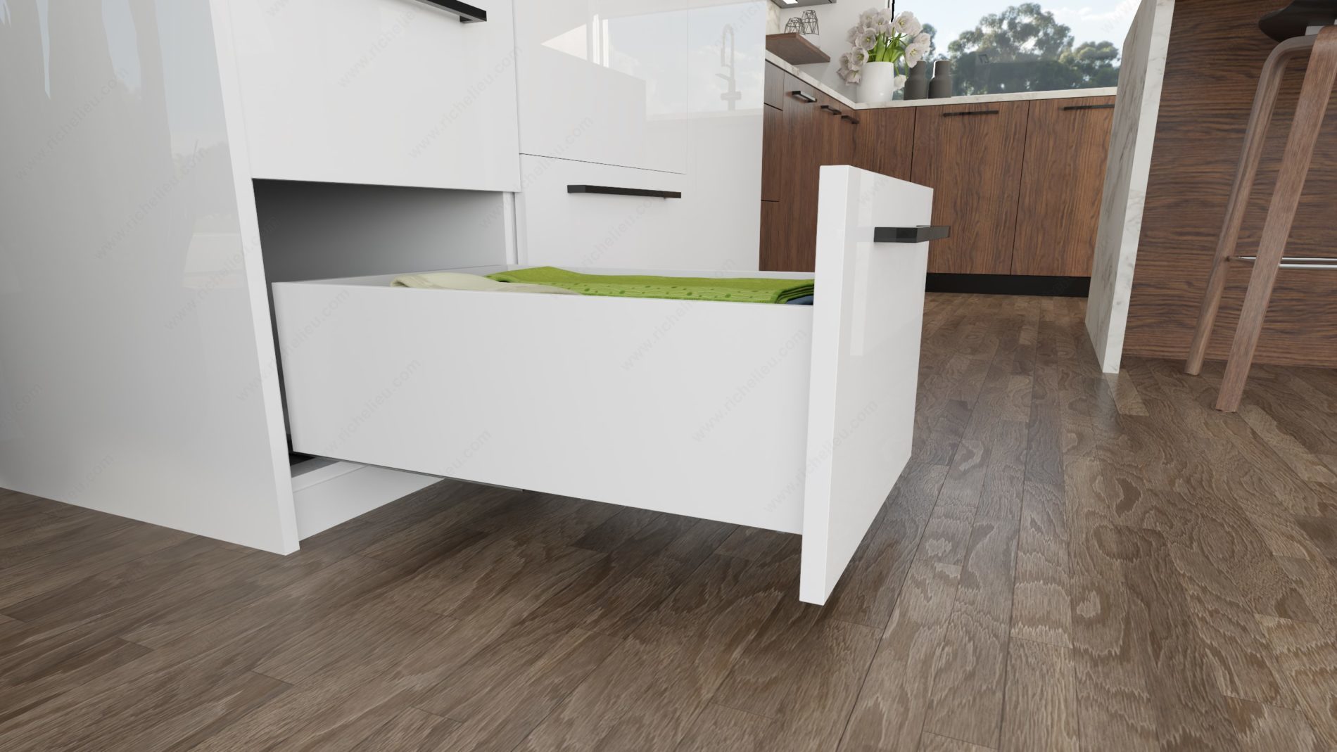 Richelieu WEBKIT1220151 OPTIMIZ-R 185 mm - Set for Standard Drawers is a sophisticated drawer system designed to enhance your storage capabilities while maintaining a sleek appearance. Featuring slim double wall panels, this metal drawer optimizes available space without compromising on style. The OPTIMIZ-R system ensures a smooth and soft-closing motion, especially when paired with Richelieu's 828 Concealed Synchronized Slides, making everyday use effortless and quiet. This product is ideal for general storage applications, providing a load capacity of 99.2 lbs to accommodate a variety of items. With dimensions of 23 5/8 inches in length and 7 9/32 inches in height, the drawer fits seamlessly into any standard setup. The high panels and double thin drawer panels in a clean white finish add a modern touch to your interiors. Installation is straightforward, thanks to the 6-way FLD clips for height, lateral, and depth adjustments, ensuring a perfect fit. The full extension undermounted slide configuration maximizes accessibility, allowing you to reach items at the back of the drawer with ease. Please note that a minimum purchase requirement of 10 sets applies. Upgrade your storage solutions with the Richelieu OPTIMIZ-R drawer system for both functionality and elegance.