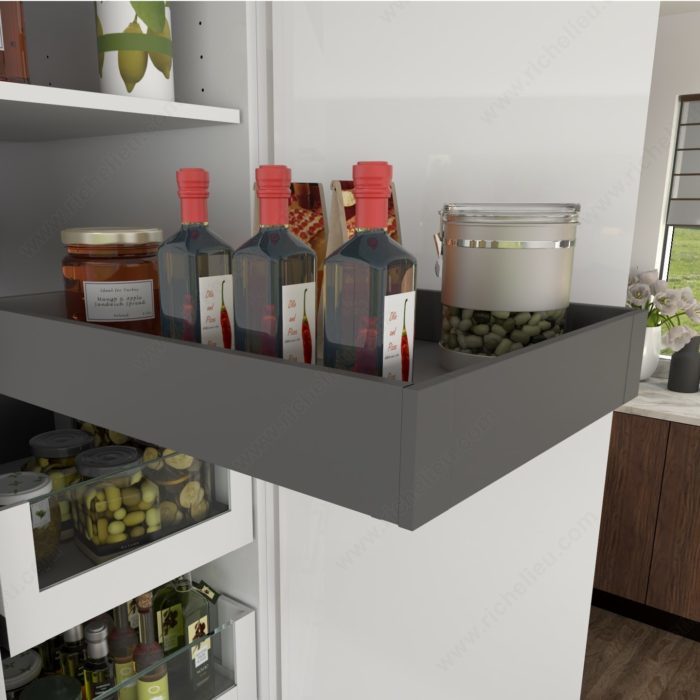 Richelieu WEBKIT1220161 OPTIMIZ-R 89 mm - Set for Inner Drawers offers a sophisticated solution for maximizing your storage space with its streamlined design. This innovative drawer system features slim double wall panels crafted from durable steel, ensuring both strength and elegance. With a generous load capacity of 99.2 lbs, it is perfect for roll-out applications, allowing you to utilize your kitchen or workspace efficiently. Equipped with 828 Concealed Synchronized Slides, the OPTIMIZ-R delivers a smooth, soft-closing movement, enhancing user experience while minimizing noise. This set includes a range of adjustable features, with 6 ways-height, lateral, and depth-to ensure a perfect fit in any cabinetry. The anthracite finish adds a contemporary touch, making it a stylish addition to any interior. Designed for full extension and undermounted slide installation, these drawers are not only functional but also easy to install. Please note that a minimum purchase requirement of 10 sets applies, making this solution ideal for both professional contractors and discerning homeowners. Enhance your space with Richelieu’s OPTIMIZ-R drawer system, where quality meets design.