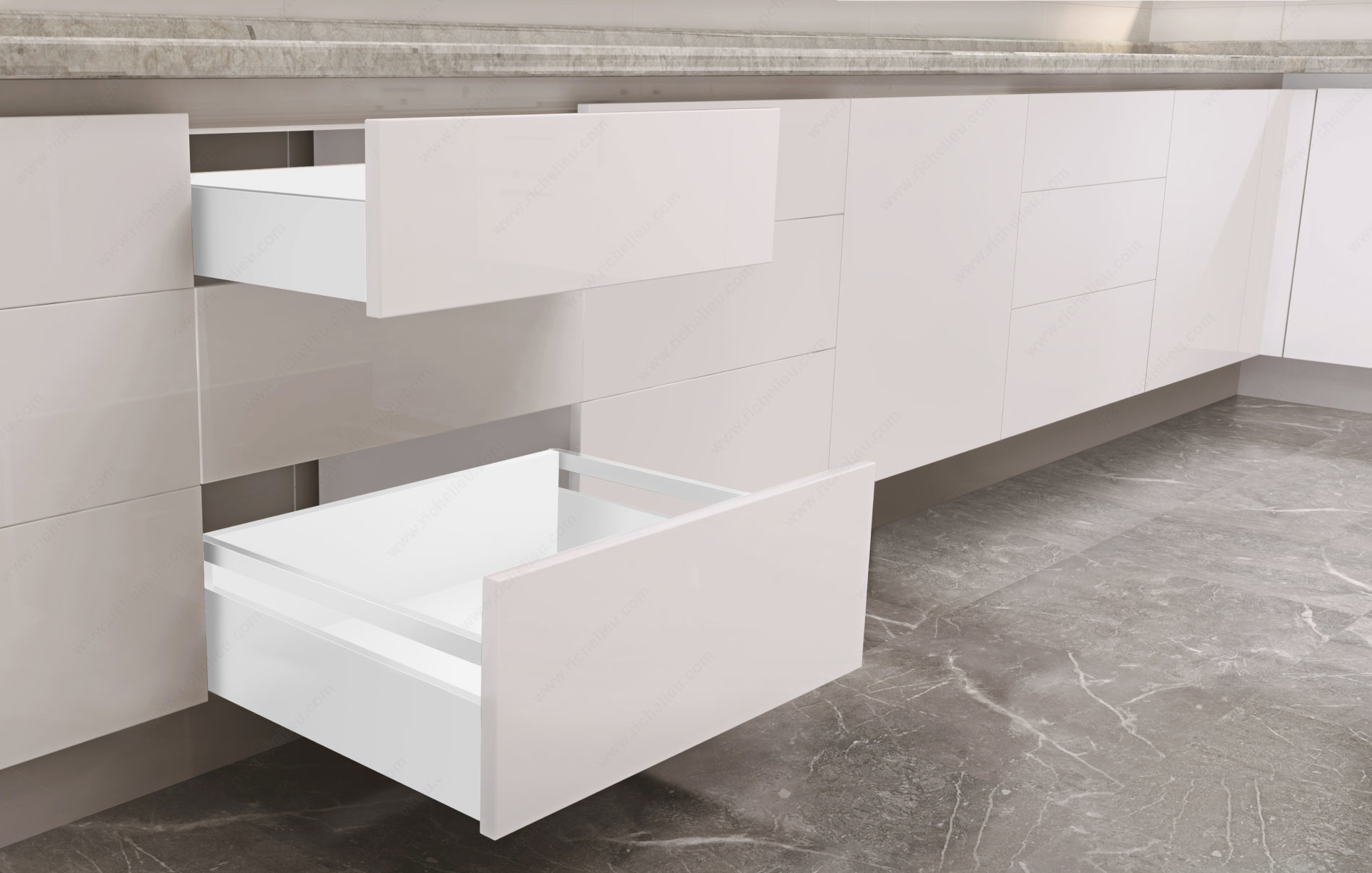 Richelieu WEBKIT1224138 OPTIMIZ-R 121 mm - Set for Drawers with Gallery Rails offers an innovative solution for creating customized drawers tailored to your specific needs. With a height of 121 mm, these drawer sides can be seamlessly combined with gallery rails, allowing for a modern and streamlined aesthetic. The rectangular tube configuration ensures a robust design while maintaining a contemporary appeal. Designed for standard drawer use, this set features a smooth soft-closing mechanism when paired with the Richelieu 828 Concealed Synchronized Slides, enhancing user experience by minimizing noise and providing a gentle closure every time. The system supports a substantial load capacity of up to 99.2 lb, making it perfect for various applications. Equipped with six-way adjustment capabilities-height, lateral, and depth-this product allows for precise alignment and installation. The white finish complements a wide range of cabinetry styles. Each set measures 4 3/4 inches in height and 10 5/8 inches in length, ensuring compatibility with standard panel sizes. Note that a minimum purchase of 10 sets is required. The Richelieu WEBKIT1224138 is an excellent choice for professionals and knowledgeable homeowners looking to elevate their drawer design with quality and functionality.