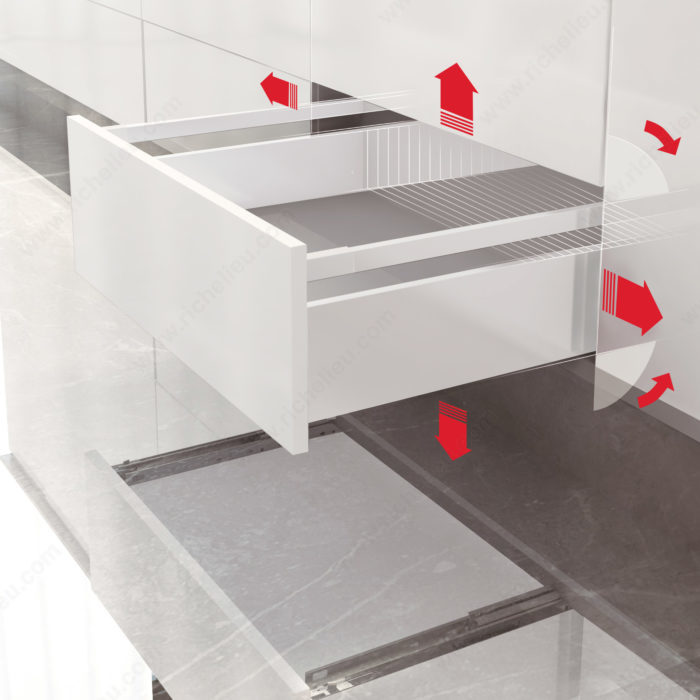 Richelieu WEBKIT1224165 OPTIMIZ-R 185 mm - Set for Drawers with Gallery Rails offers an exceptional solution for creating custom drawers tailored to your specifications. With the ability to combine 185 mm drawer sides and gallery rails, this set provides the flexibility to achieve your desired height while maintaining a sleek, modern aesthetic. The rectangular rails not only enhance the visual appeal of your interiors but also promise functionality and durability. Designed to work seamlessly with Richelieu's 828 Concealed Synchronized Slides, this system ensures a smooth, soft-closing movement, elevating the user experience. Each set features a load capacity of 99.2 lbs, making it suitable for standard drawer use, while the anthracite finish adds a contemporary touch to your cabinetry. The rails come with four-way adjustment capabilities via FLD clips, allowing for precise height and lateral adjustments to ensure perfect alignment. This product is shipped via UPS and requires a minimum purchase of 10 sets, making it a practical choice for both professional builders and discerning homeowners. The full extension, undermounted slide technology further enhances functionality, ensuring that every drawer opens effortlessly. Embrace modern design and superior performance with the Richelieu WEBKIT1224165 OPTIMIZ-R drawer set.