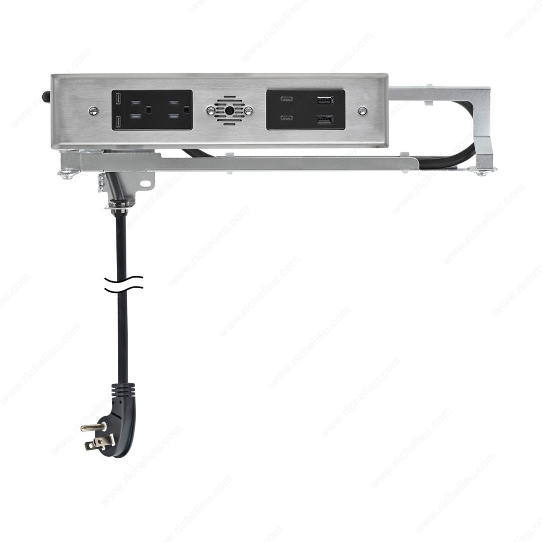 Richelieu WEBSO1250219 Blade Series Deep Cabinet Blade Duo Docking Drawer 1514-278-X30 offers an innovative solution for modern kitchens, combining safety, quality, and sleek design. As the only ETL-Listed in-drawer outlet, it features extended cable management arms that accommodate deeper and wider cabinets, perfect for contemporary kitchen islands. This design ensures that cords are neatly guided and protected as drawers open and close, eliminating clutter and enhancing usability. Safety is paramount with this docking drawer, which includes a built-in thermostat that automatically cuts off power if temperatures exceed 120 °F (49 °C), providing peace of mind during use. Constructed from premium all-metal components, this outlet is built to last and designed to adapt to evolving technology. Equipped with an impressive connectivity suite, the outlet supports 2 USB-C ports at 65W and 30W, 2 USB-A ports, and 2 AC outlets, making it perfect for charging multiple devices simultaneously. Its recessed mounting and stainless steel finish give it a polished look that complements any kitchen decor. With a height and width of 2-17/32 in and a length of 11-1/4 in, this docking drawer is compact yet highly functional. Transform your kitchen experience with the Richelieu Blade Series Docking Drawer.