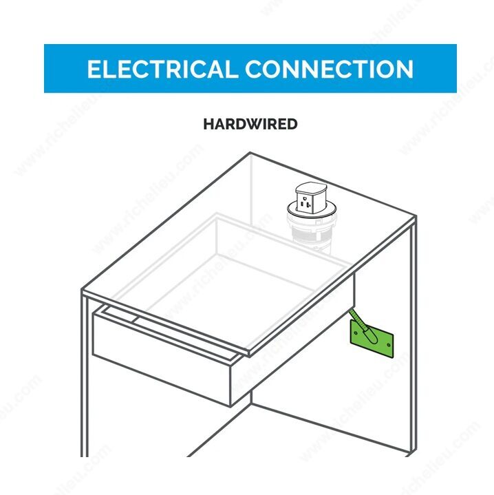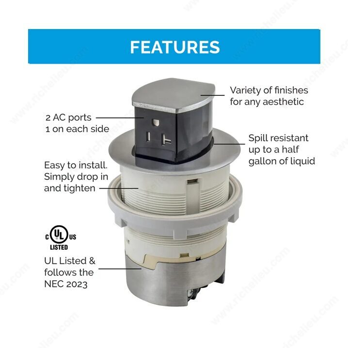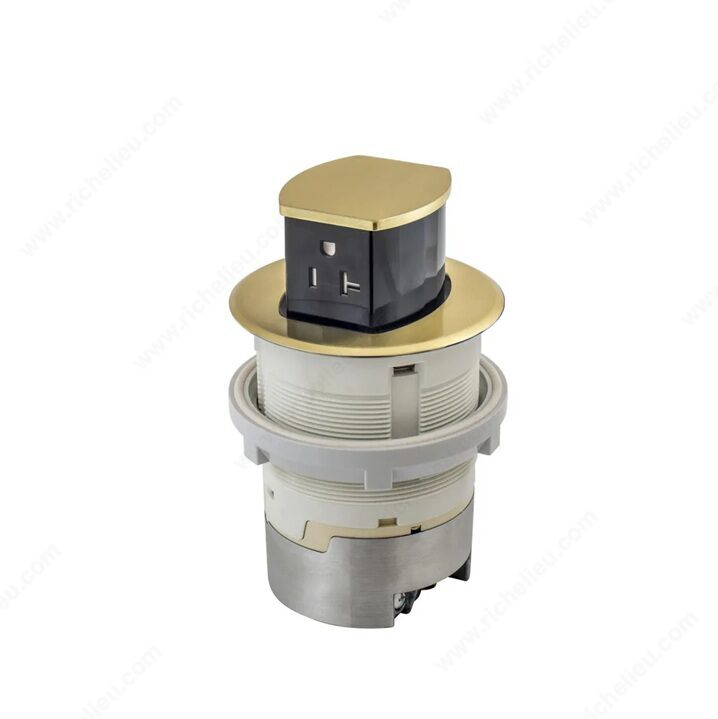 Richelieu WEBSO1250231 Hubbell Pop-Up Countertop Outlet (20 AMP)Richelieu WEBSO1250231 Docking Drawer Hubbell Countertop Pop-Up Outlet (20 AMP) offers a sleek and functional solution for modern power access in kitchens, offices, and contemporary spaces. This UL-listed outlet is designed to seamlessly blend with your countertop while providing dual AC connections for added flexibility. With two mounting options, the installation is straightforward. The surface mount option places the outlet ring just 1 inch above the countertop, ensuring easy access without compromising aesthetics. For a more integrated look, the flush mount option allows the outlet to sit completely recessed, creating a clean and uncluttered workspace. Safety and durability are paramount, and this outlet meets the highest standards in both the U.S. and Canada, making it a reliable choice for any professional setting. The minimalist brass finish enhances its appeal, ensuring it complements various interior designs. Designed for versatility, the Richelieu Countertop Pop-Up Outlet is perfect for any area where discreet power access is essential. With its combination of functionality, safety, and elegant design, this outlet keeps power within easy reach while maintaining a sophisticated appearance in your space. Elevate your workspace with this essential addition.