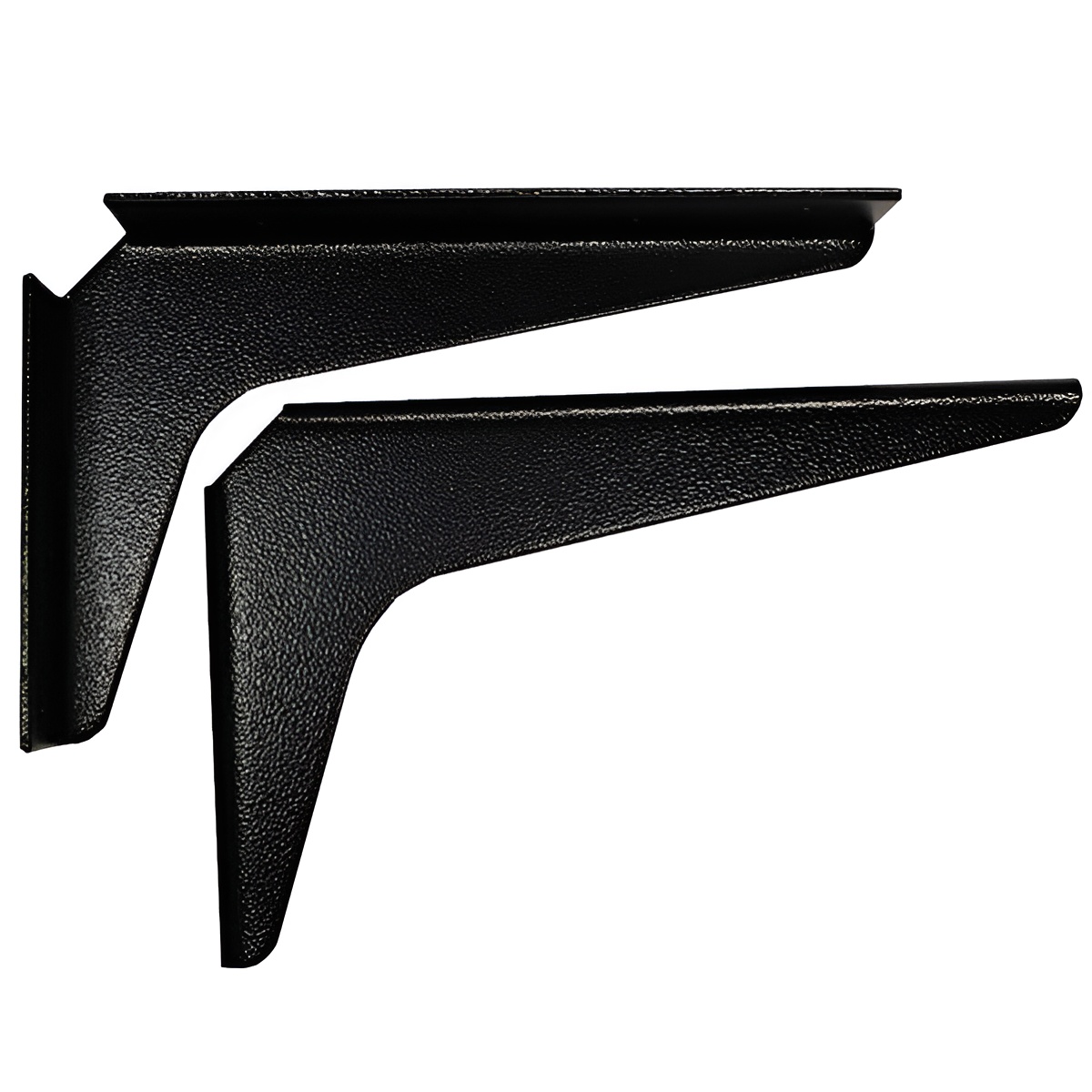 RPC, US FUTABA, A&M B08-18182-2K4 Work Station Bracket 1/8" x 18x18 Black offers robust support for a variety of applications. These high-quality cantilever support brackets are engineered to hold up to 1,000 lbs per pair when securely fastened with 1/4" lag bolts that are 2-1/2" long into a 2x4. Their versatile design makes them ideal for creating computer workstations, garage shelving, ADA-compliant stations, and more. Constructed from durable 1/8" steel, the brackets feature multiple 1/4" mounting holes on each side, allowing for flexible installation options (fasteners not included). Available in a sleek black powder coat finish, these brackets also come in almond, gray, and white, ensuring they can complement any decor. The reversible design further enhances their usability, enabling the installation of either the short or long leg for shelving. Additionally, the larger sizes include a 3" x 3" notch, providing clearance for wall cleats and wiring. Please note that the load capacity may vary based on the fastening type used. Packaged in pairs, the RPC Work Station Bracket is a reliable choice for heavy-duty support, making it an essential addition to your hardware collection.