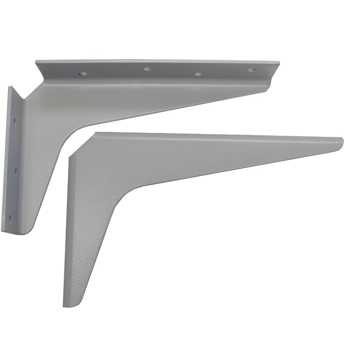 RPC B08-24293-GK4 Work Station Bracket 1/8" x 24" x 29" Gray offers exceptional strength and versatility for your workspace needs. Crafted from robust 1/8" steel, this cantilever support bracket can easily handle up to 1000 lbs per pair when securely mounted with 1/4" lag bolts that are 2-1/2" long into a 2x4. This makes it an ideal choice for computer workstations, garage shelving, and ADA-compliant stations. Designed with practicality in mind, the bracket features multiple 1/4" mounting holes on each side for flexible installation options. The reversible design allows users to choose between short or long leg configurations for different shelving needs. Additionally, the larger sizes include a 3" x 3" notch to accommodate wall cleats and wire runs, enhancing functionality while keeping your space organized. Available in an array of powder coat finishes-black, almond, gray, and white-this bracket can seamlessly blend into any environment. Packaged in pairs, the RPC B08-24293-GK4 delivers both durability and ease of use, making it a must-have for both building professionals and knowledgeable homeowners looking to optimize their storage solutions. Note that the load capacity is limited by the type of fastening used.