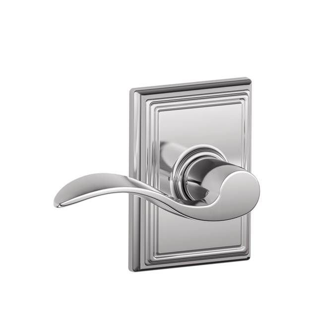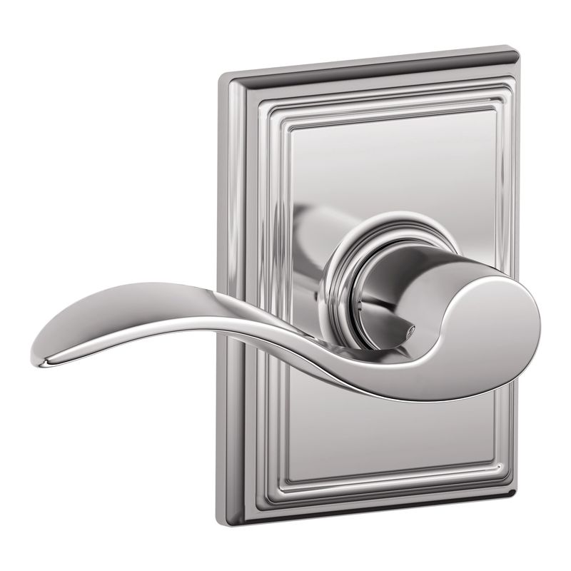 Schlage Residential F10ACC625ADD Accent Lever with Addison Rose Passage Lock is a perfect solution for interior spaces where locking isn't a requirement, such as closets or rooms. This non-locking passage lock is designed for doors ranging from 1-3/8" to 1-3/4" thick, making it versatile for various residential applications. Featuring an elegant Accent Lever paired with an Addison Rose, this lockset not only provides functionality but also enhances the aesthetic appeal of your doors with its bright chrome finish. Installation is straightforward, requiring only a screwdriver and following an easy 3-step process. The reversible handing allows flexibility for either left or right-handed doors, ensuring it fits seamlessly within your home. Constructed from quality zinc materials, the F10ACC625ADD offers exceptional durability and security, certified to Commercial Grade 2 standards. This lockset comes equipped with a 16080 latch and a 10027 strike, including a round corner full lip strike for added stability. Backed by a limited lifetime mechanical and finish warranty, Schlage ensures lasting performance and a stylish finish that coordinates beautifully with plumbing and lighting fixtures. Upgrade your interior doors with this reliable and attractive passage lock from Schlage.