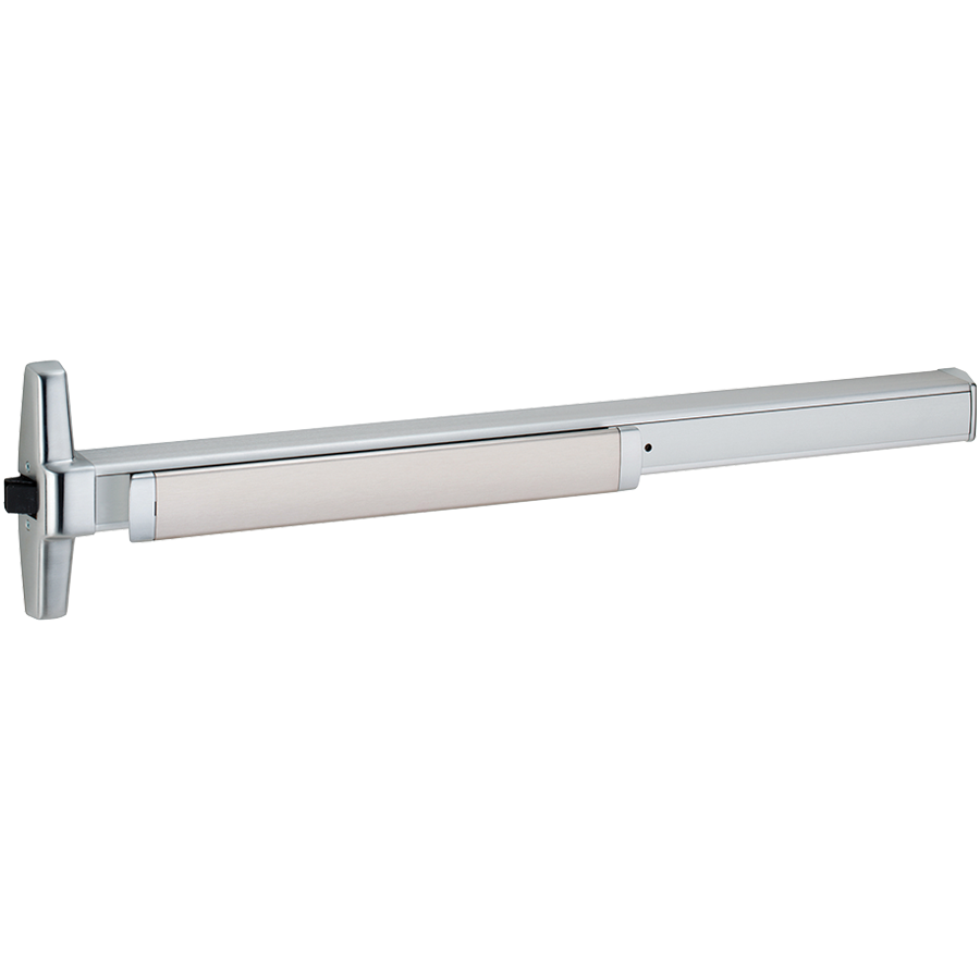Narrow Stile Rim Exit Device, Exit Only No Trim, AX (5lbs Accessible California Building Code), PA (Pushpad Armor), 48in Hex Dogging, Grade 1, 626/US26D Satin Chrome